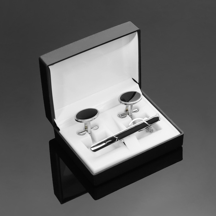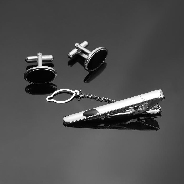 Набор мужской медный «Запонки + Зажим для галстука» овал с эмалью, чёрный в серебре