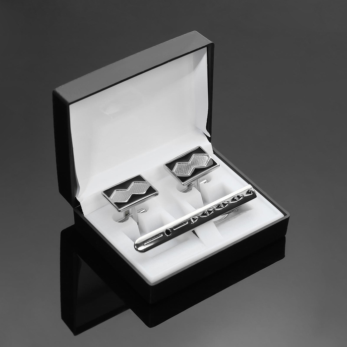 Набор мужской медный «Запонки + Зажим для галстука» прямоугольник с ромбами, чёрный в серебре