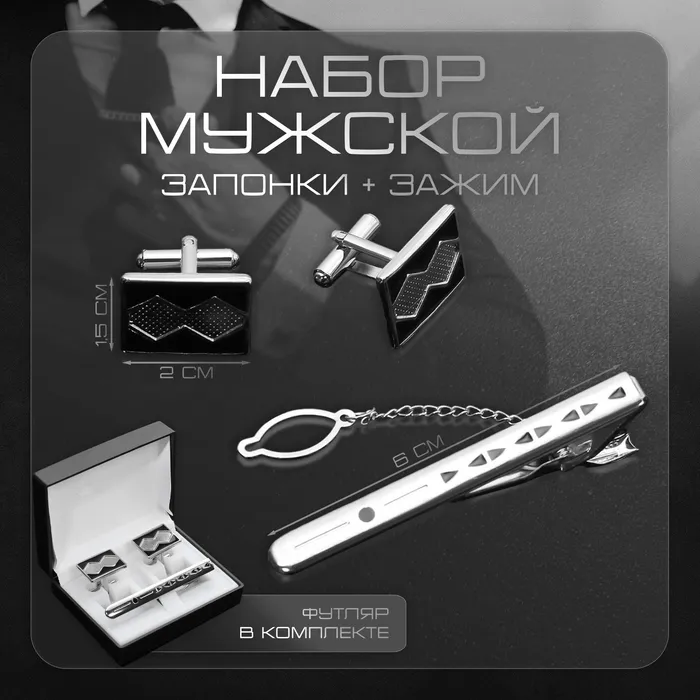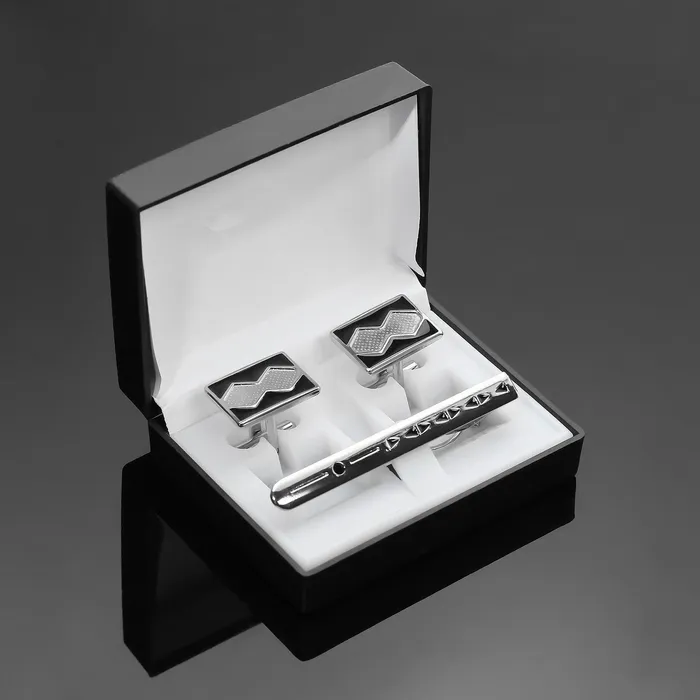 Набор мужской медный «Запонки + Зажим для галстука» прямоугольник с ромбами, чёрный в серебре — Характеристики