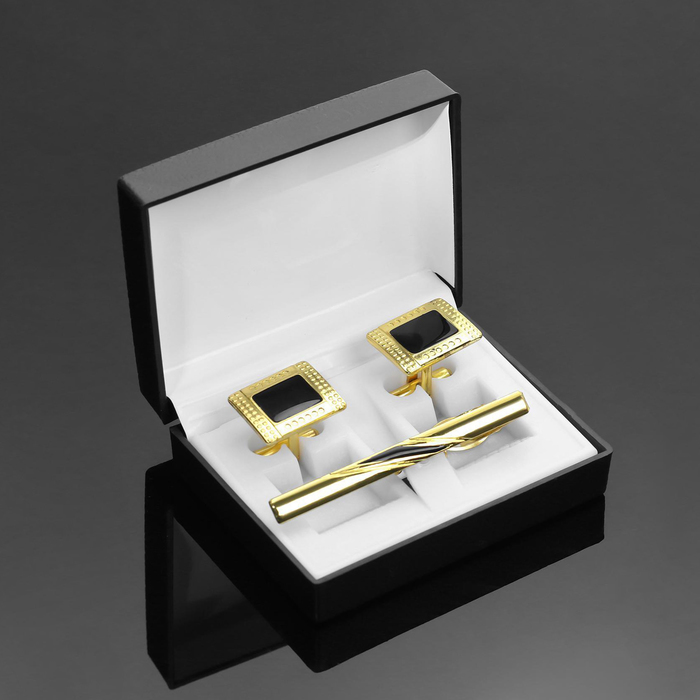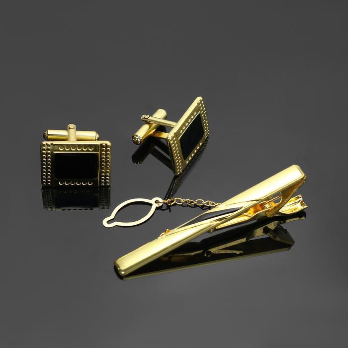 Набор мужской медный «Запонки+Зажим(6 см)для галстука» точеч рисунок, прямоуг, чёрный в зол