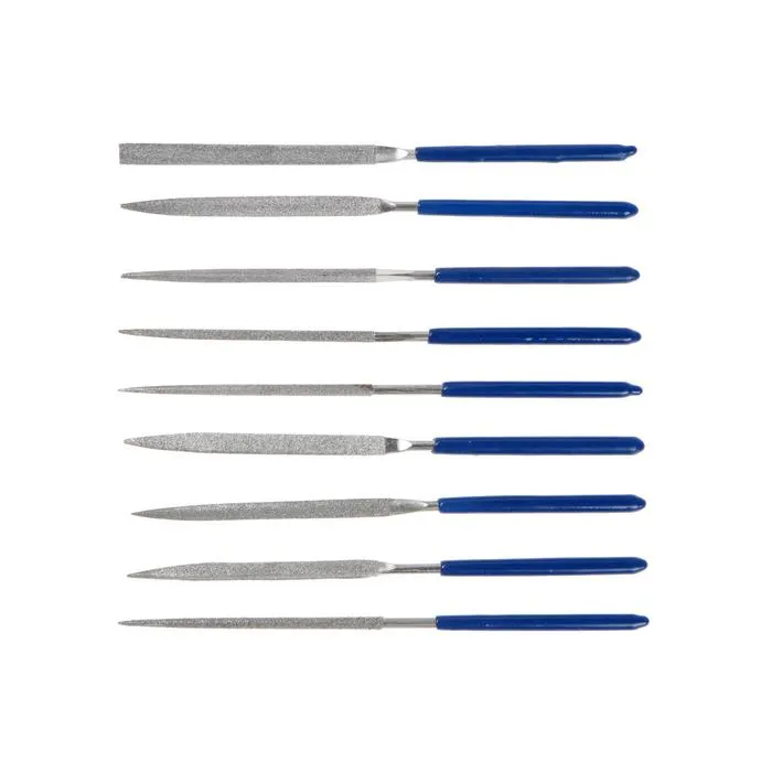 Используйте надфили для чистового опиливания и доводки поверхностей стали, керамики, стекла и графита. Алмазное покрытие, нанесённое на рабочую поверхность, увеличивает износостойкость и срок службы инструмента. Рукоятки из пластмассы предотвращают выскальзывание из рук и добавляют комфорта при работе.