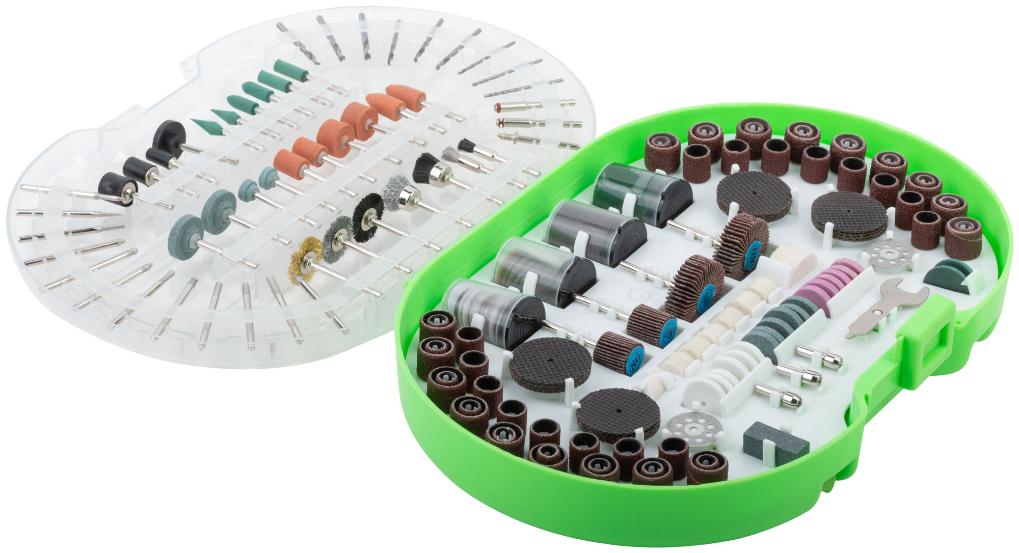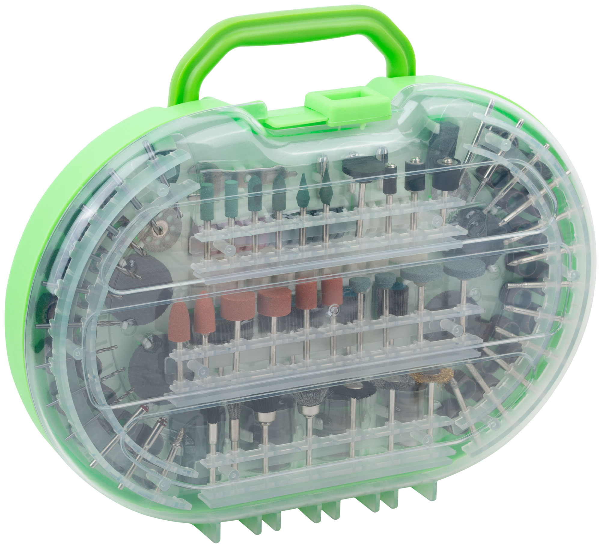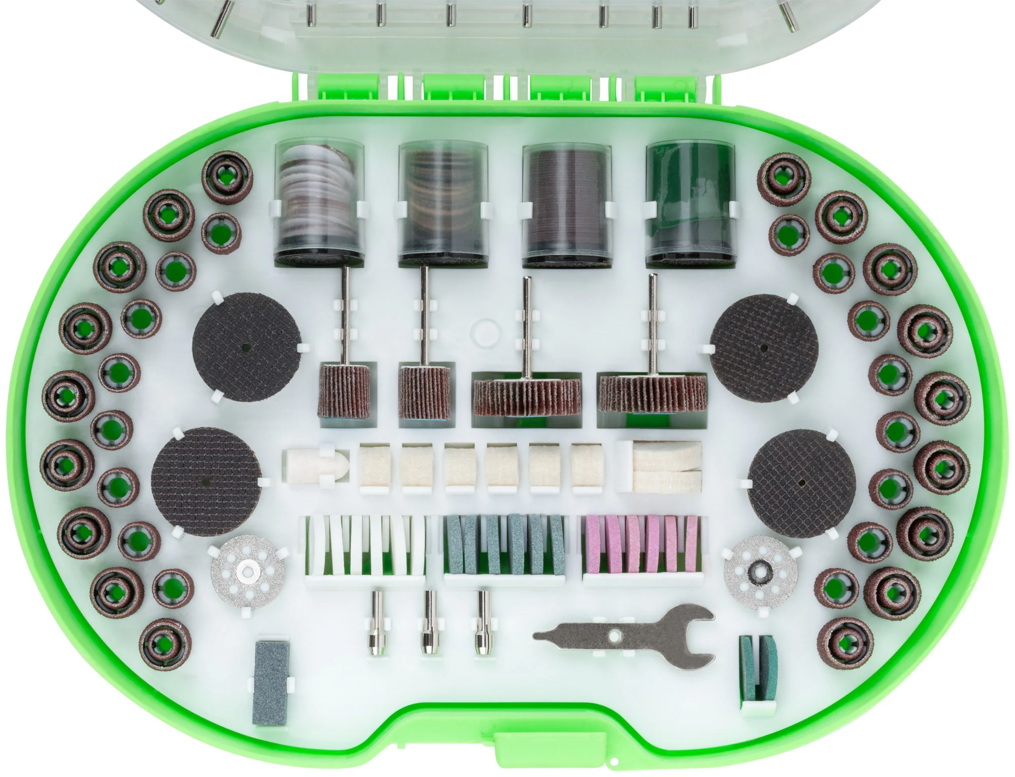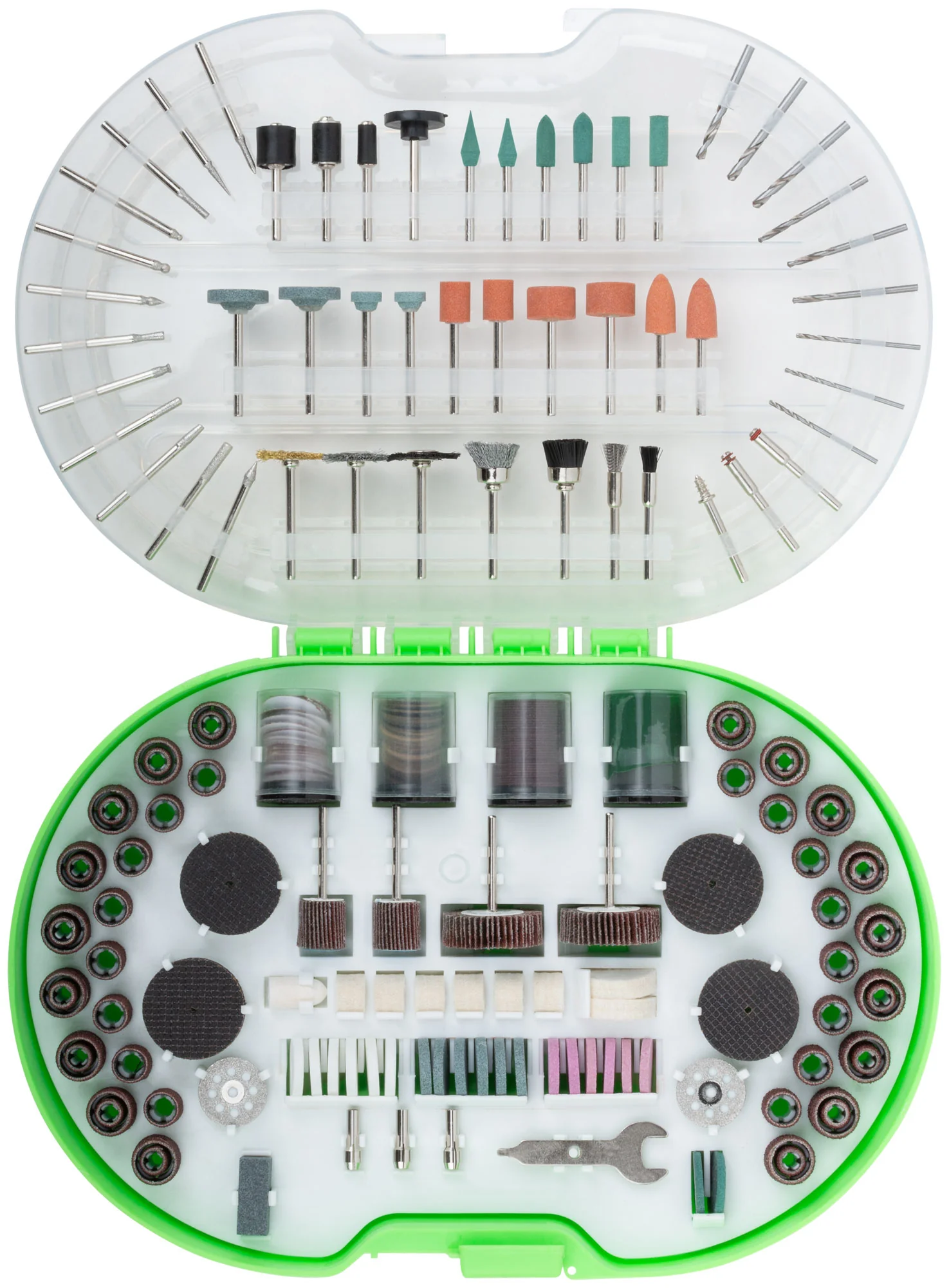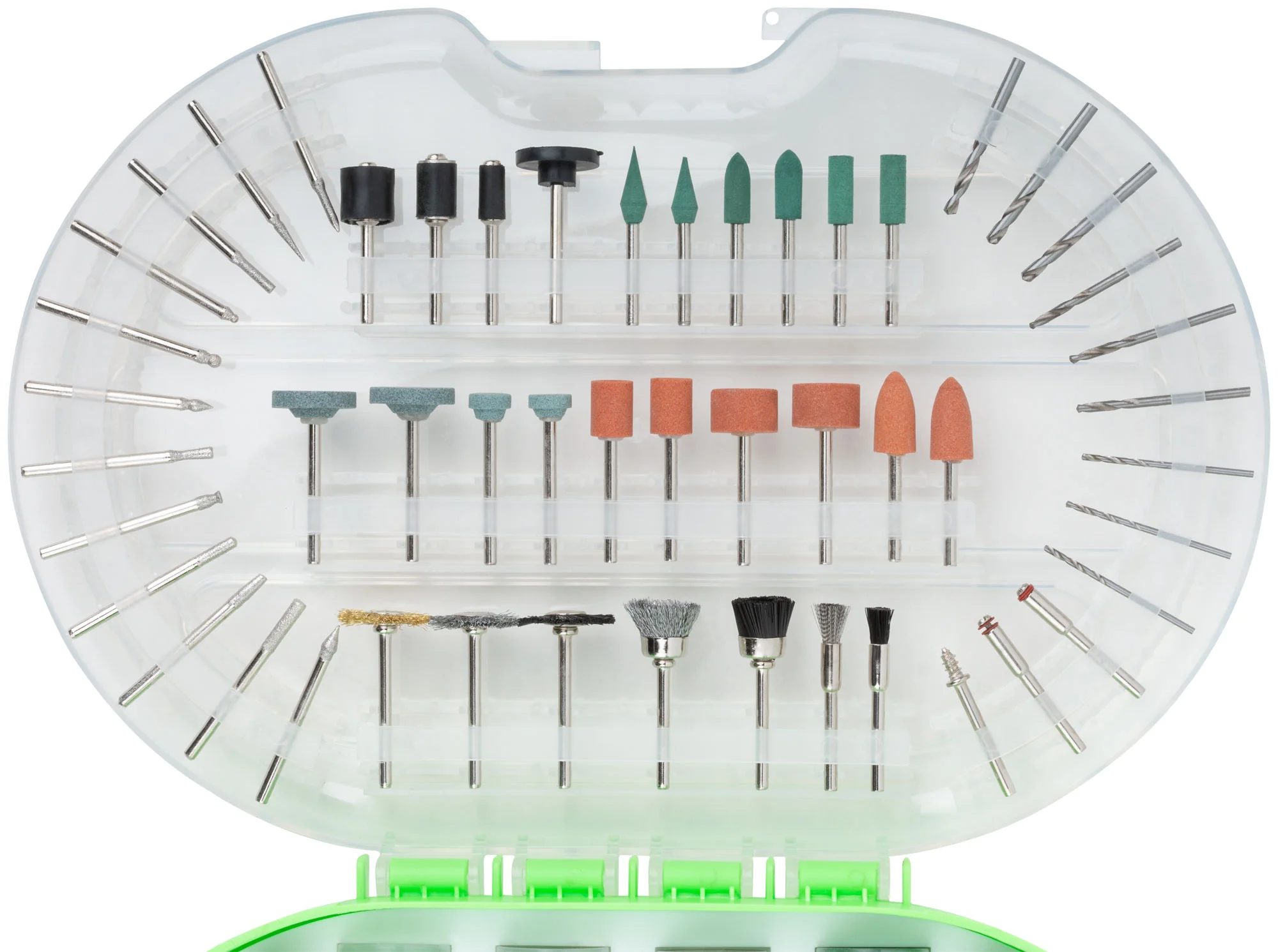 Набор включает в себя разнообразные насадки: от резиновых и абразивных шарошек до сверл по металлу и корщеток. Упакованный в прочный пластиковый чемоданчик, он легко переносится и хранится, что делает его идеальным для профессионалов, работающих на выезде.