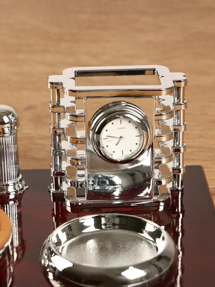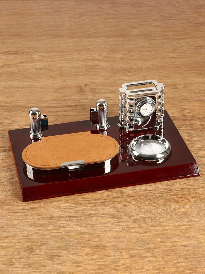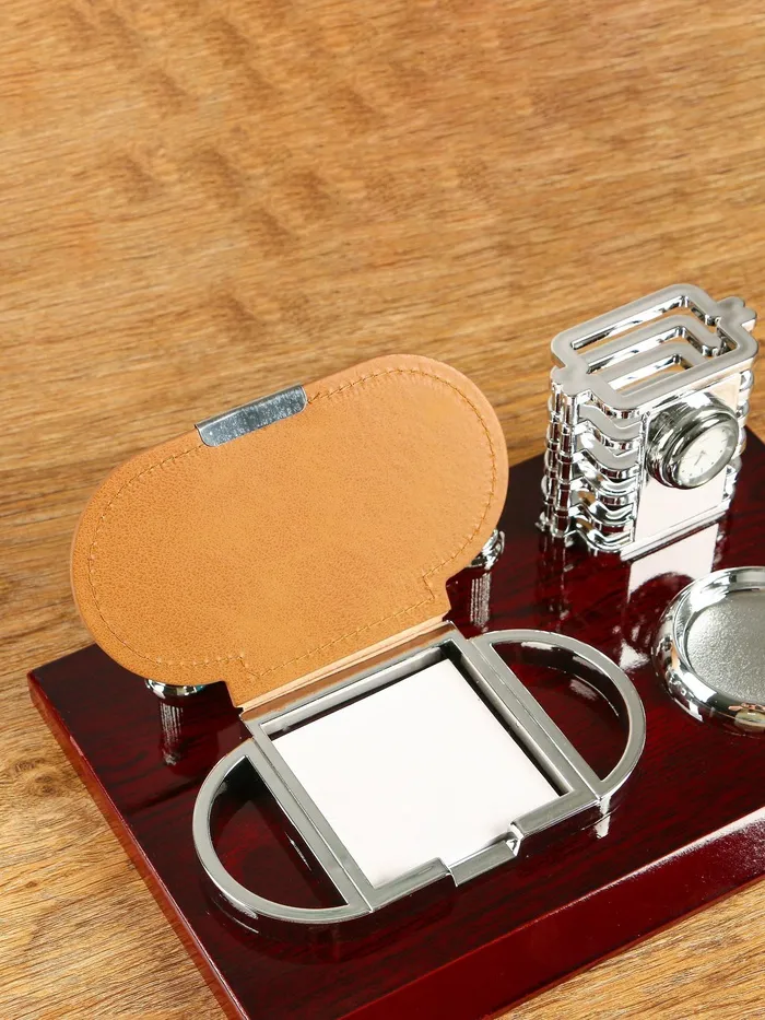 Компактный настольный набор поможет избежать хаоса на рабочем месте. Храните в нём канцелярские принадлежности или другие мелочи, чтобы правильно организовать пространство. К тому же изделие имеет минималистичный дизайн и выполнено под дерево, поэтому оно украсит собой любое место как декоративный элемент.