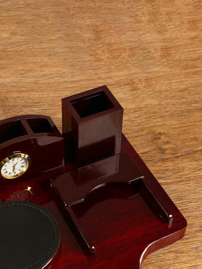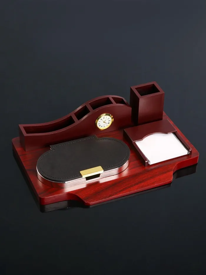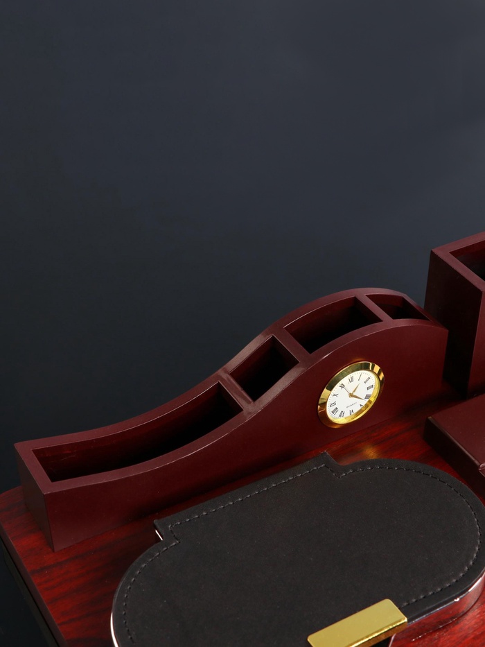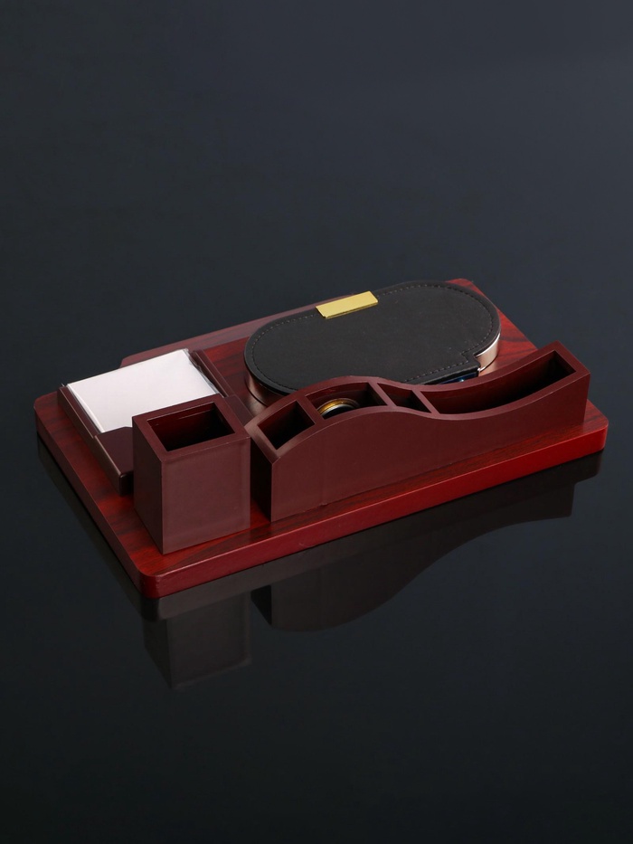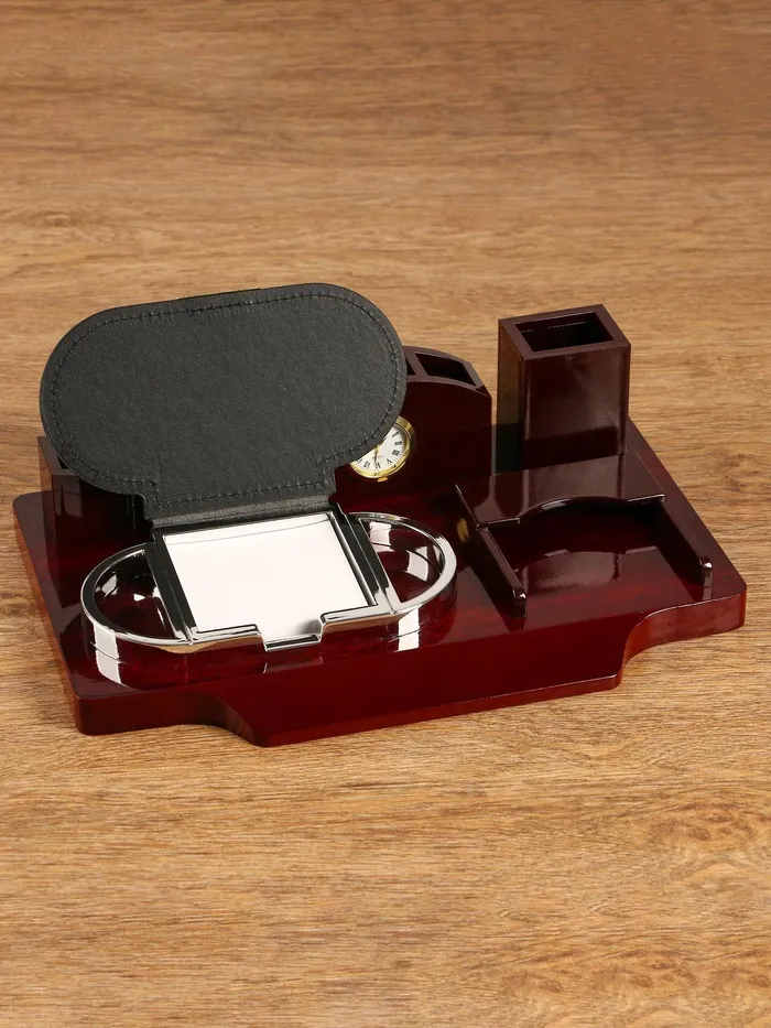 Компактный настольный набор поможет избежать хаоса на рабочем месте. Храните в нём канцелярские принадлежности или другие мелочи, чтобы правильно организовать пространство. К тому же изделие имеет минималистичный дизайн и выполнено под дерево, поэтому оно украсит собой любое место как декоративный элемент.
