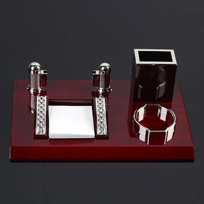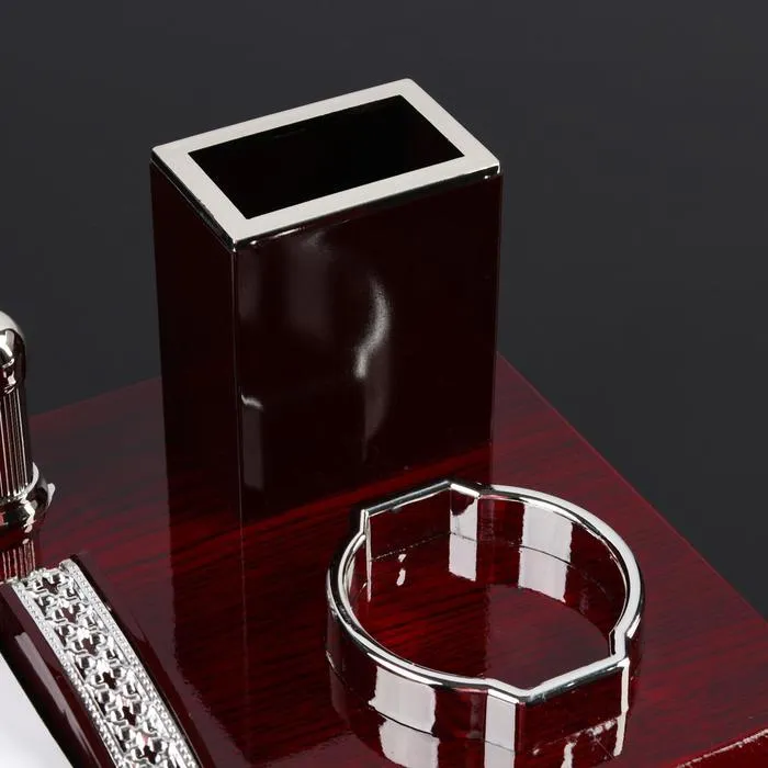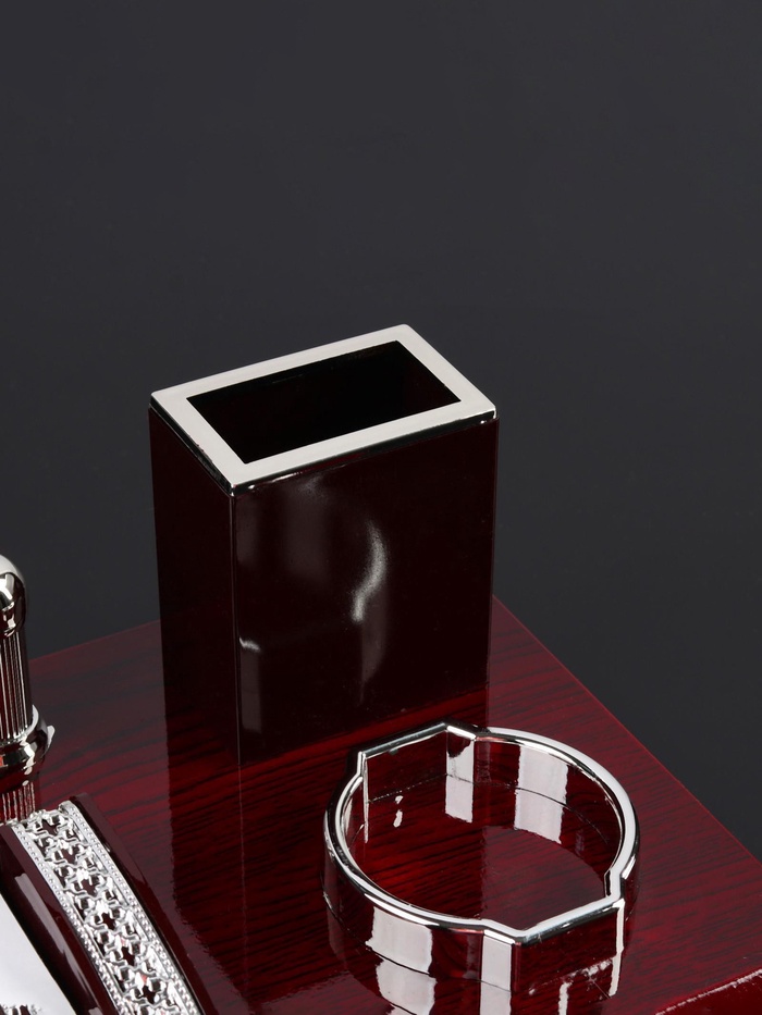 Компактный настольный набор поможет избежать хаоса на рабочем месте. Храните в нём канцелярские принадлежности или другие мелочи, чтобы правильно организовать пространство. К тому же изделие имеет минималистичный дизайн и выполнено под дерево, поэтому оно украсит собой любое место как декоративный элемент.