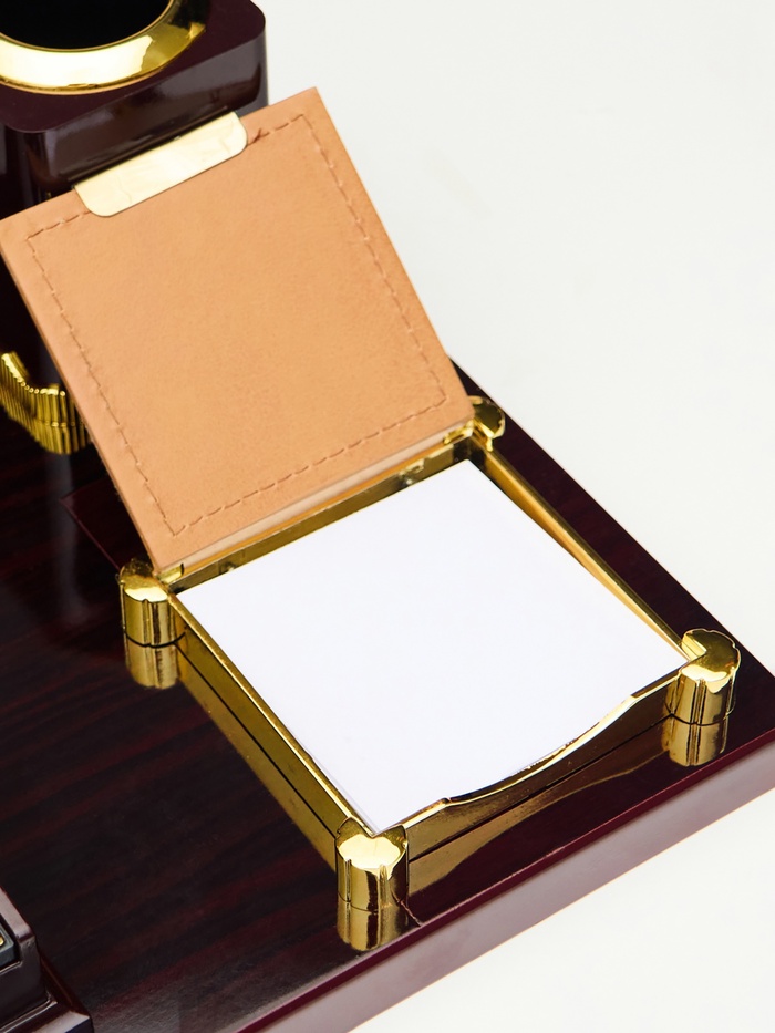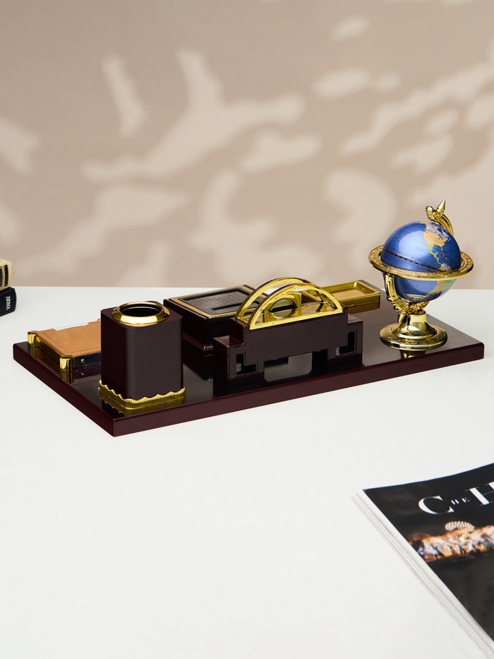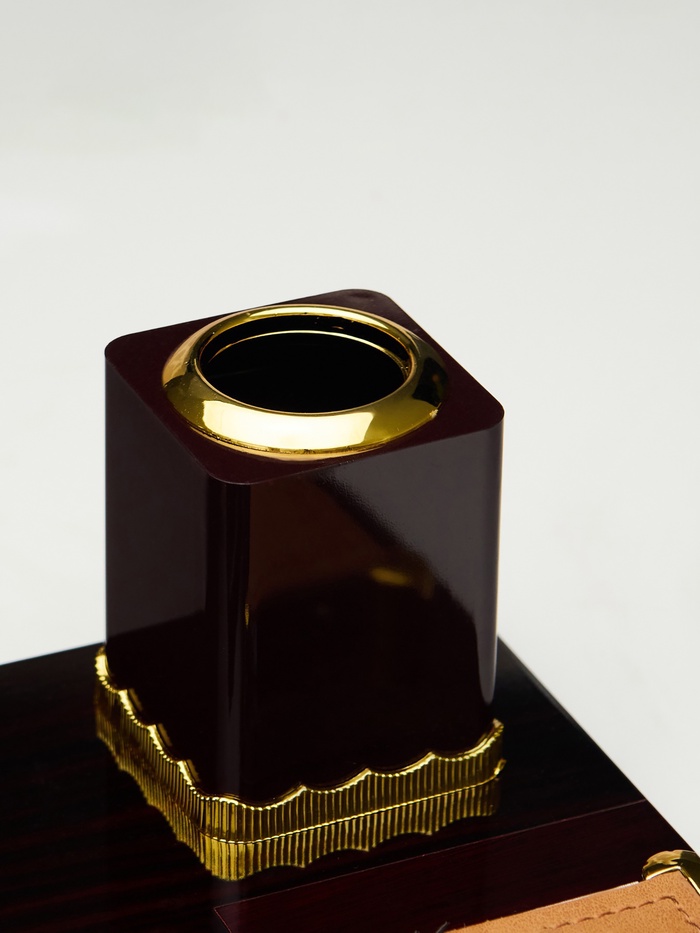 Компактный настольный набор поможет избежать хаоса на рабочем месте. Храните в нём канцелярские принадлежности или другие мелочи, чтобы правильно организовать пространство. К тому же изделие имеет минималистичный дизайн и выполнено под дерево, поэтому оно украсит собой любое место как декоративный элемент.