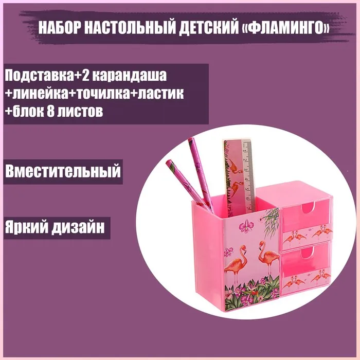 Настольный набор позволяет эргономично и оригинально организовать размещение канцелярских принадлежностей ребенка.