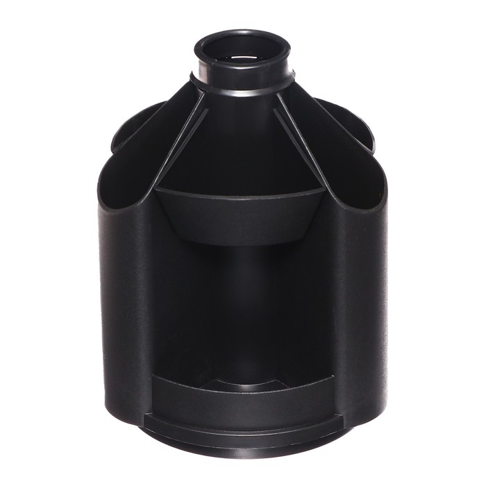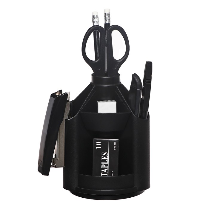 Настольный набор-органайзер, 13 предметов (шариковая ручка - 1 шт., карандаш с ластиком - 2 шт., ножницы, нож, линейка, точилка, степлер №10, скобы №10 - 500 шт., скрепки, кнопки-гвоздики, ластик, подставка), черный, вращающийся на 360 градусов.