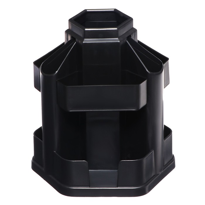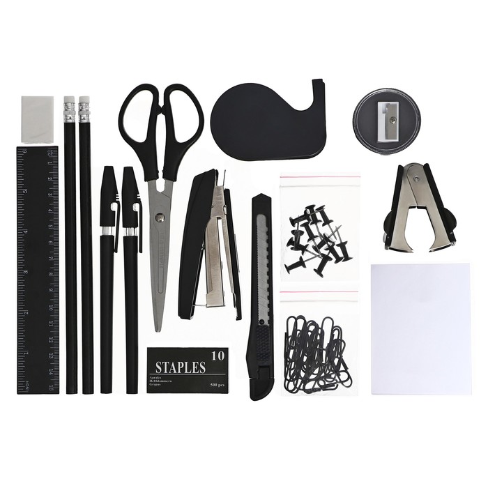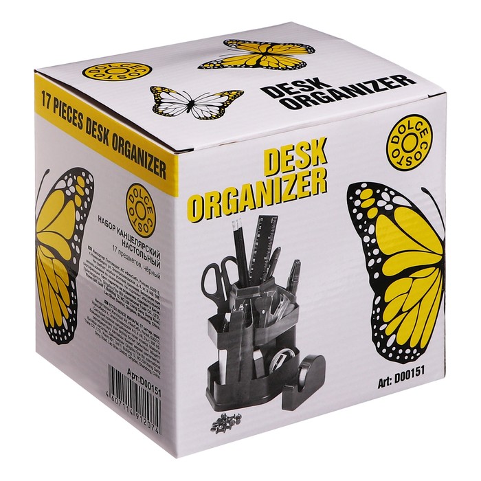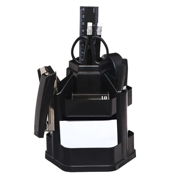Настольный набор-органайзер, 17 предметов (шариковая ручка - 2 шт., карандаш с ластиком - 2 шт., ножницы, нож, линейка, точилка, степлер №10, скобы №10 - 500 шт., скрепки, кнопки-гвоздики - 10 шт., клейкая лента в диспенсере, антистеплер, бумага для заметок, ластик, подставка), черный, вращающийся на 360 градусов.
