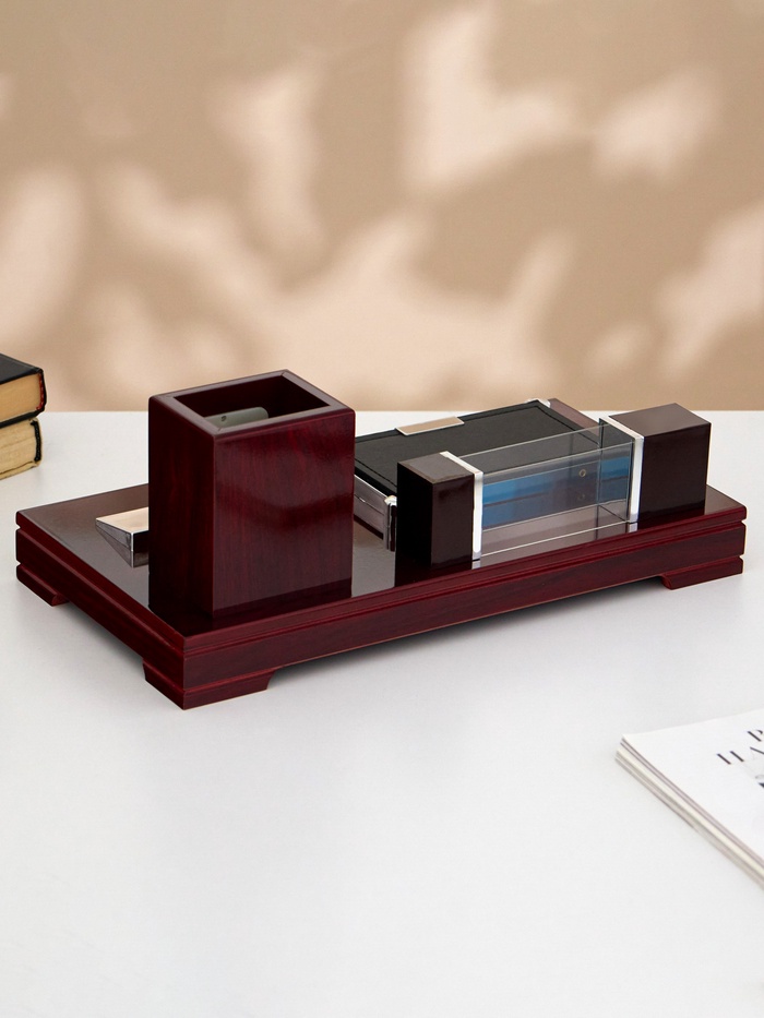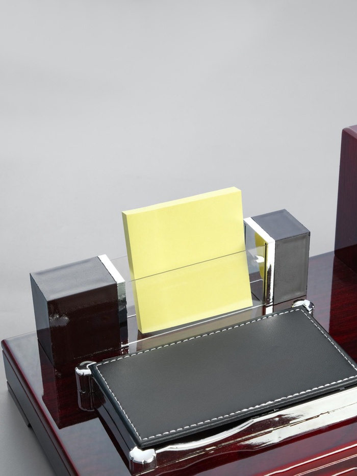 Компактный настольный набор поможет избежать хаоса на рабочем месте. Храните в нём канцелярские принадлежности или другие мелочи, чтобы правильно организовать пространство. К тому же изделие имеет минималистичный дизайн и выполнено под дерево, поэтому оно украсит собой любое место как декоративный элемент.
