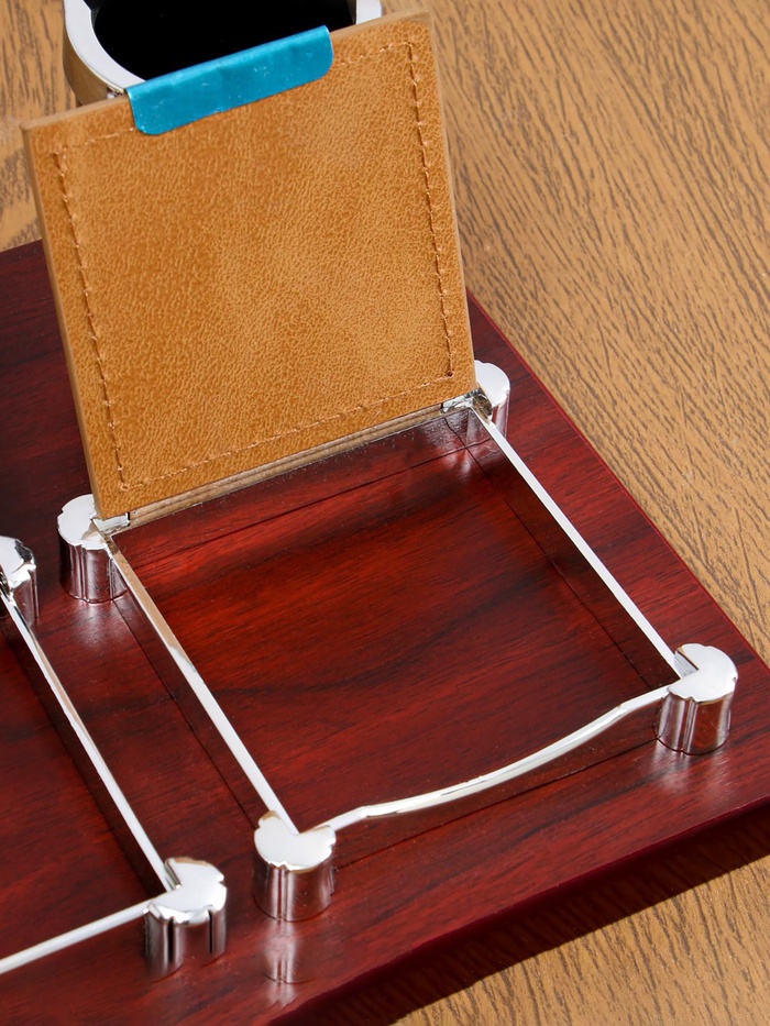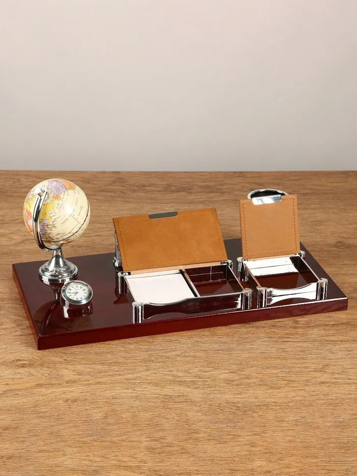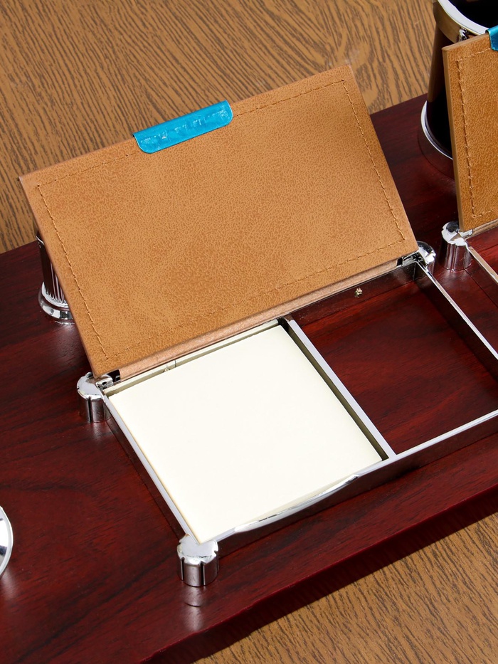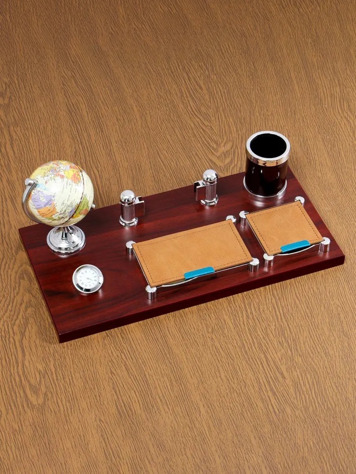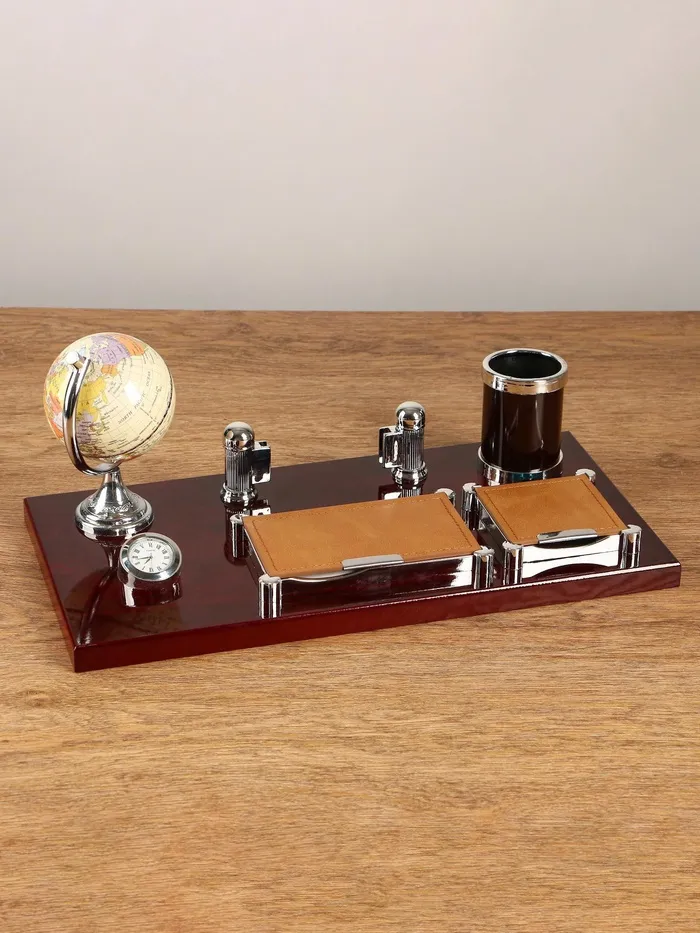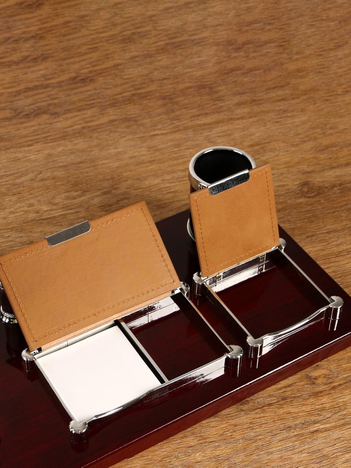 Компактный настольный набор поможет избежать хаоса на рабочем месте. Храните в нём канцелярские принадлежности или другие мелочи, чтобы правильно организовать пространство. К тому же изделие имеет минималистичный дизайн и выполнено под дерево, поэтому оно украсит собой любое место как декоративный элемент.