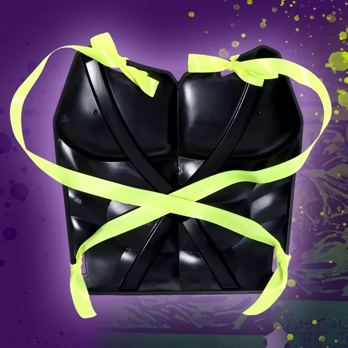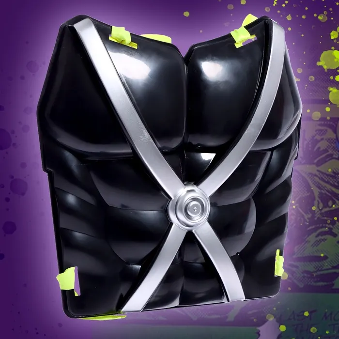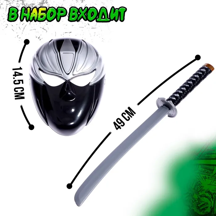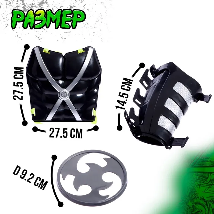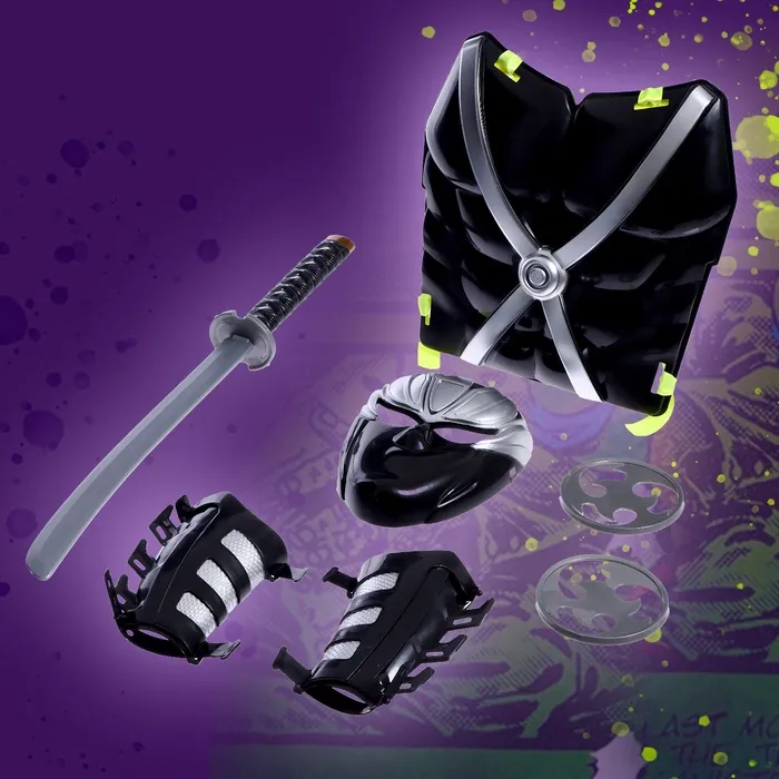 - В комплект входят 7 предметов: маска, катана, два сюрикена, два защитных наруча и панцирь, выполненные в стильном чёрном и серебристом дизайне.