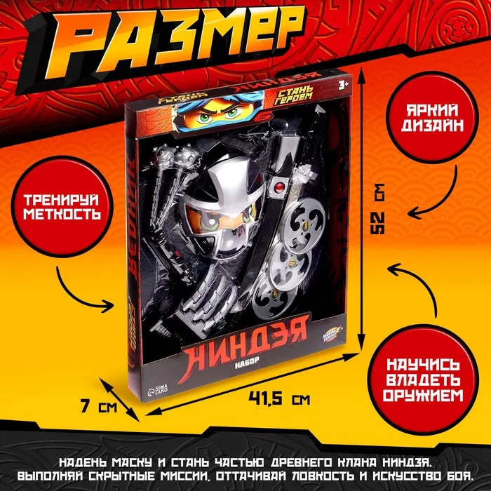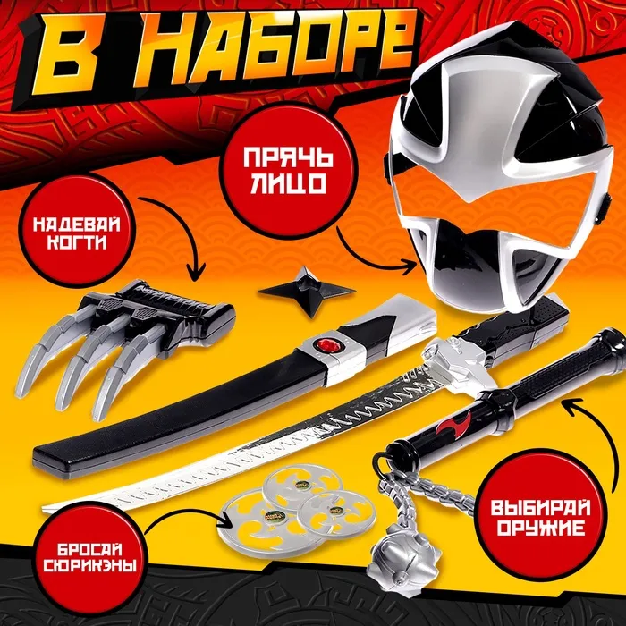 - В набор входят: маска, катана, сая, двойной моргенштерн, сюрикен, имитация перчатки с когтями и 3 диска.