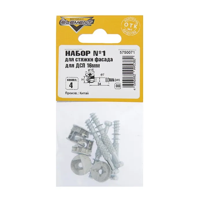 Набор предназначен для стяжки фасада, изготовленного из ДСП. Фиксация соединения производится поворотом эксцентрика по часовой оси.