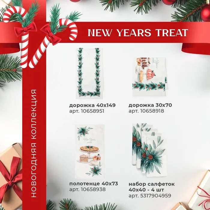 Набор новогодний столовый New Years treat скатерть 150х180см +/-3см с ВГМО, салфетка 40х40см-8 шт, 100%хл — Характеристики