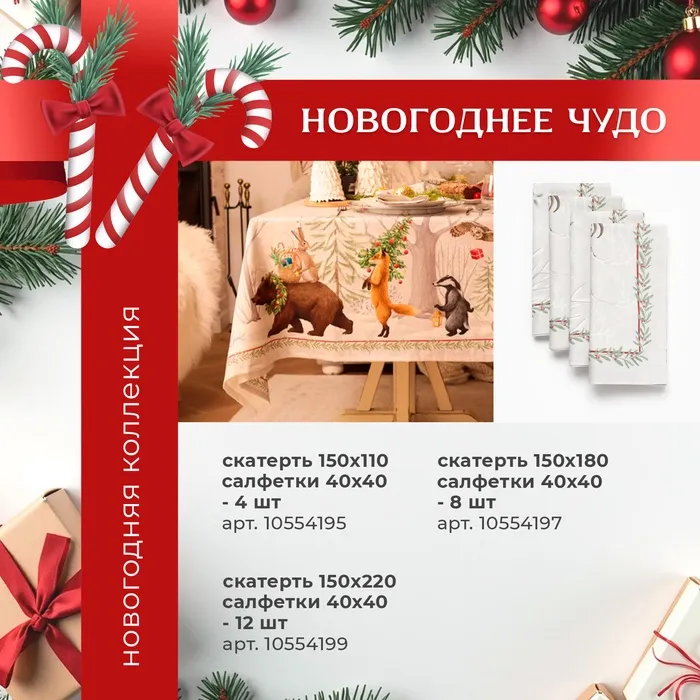 Набор новогодний столовый "Новогоднее чудо" скатерть 150х220см +/-3см с ВГМО, салфетка 40х40см-12 шт, 100%хл — Характеристики