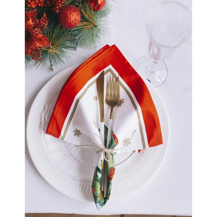 Столовый набор украсит праздничный интерьер. Изделия с эксклюзивным принтом сшиты из хлопкового полотна. Этот материал имеет плотную и упругую структуру, обладает высокой прочностью и на ура справляется с первостепенными задачами: