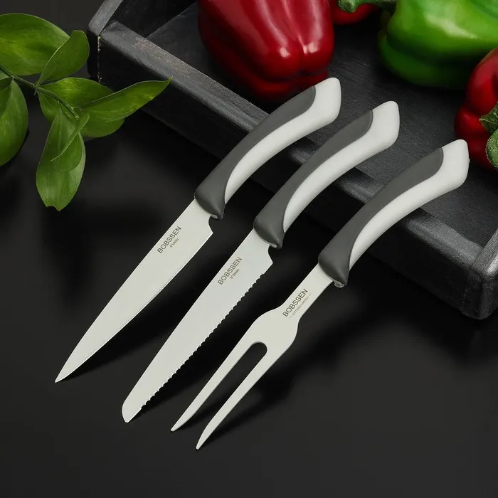 - В комплект входят три предмета: ножи и вилка для мяса, что обеспечивает полный набор для повседневных задач на кухне.