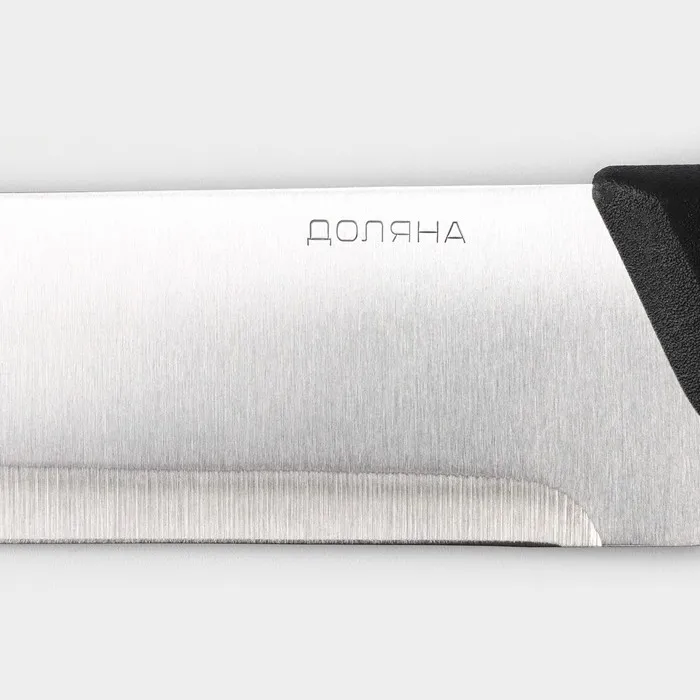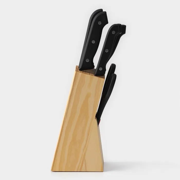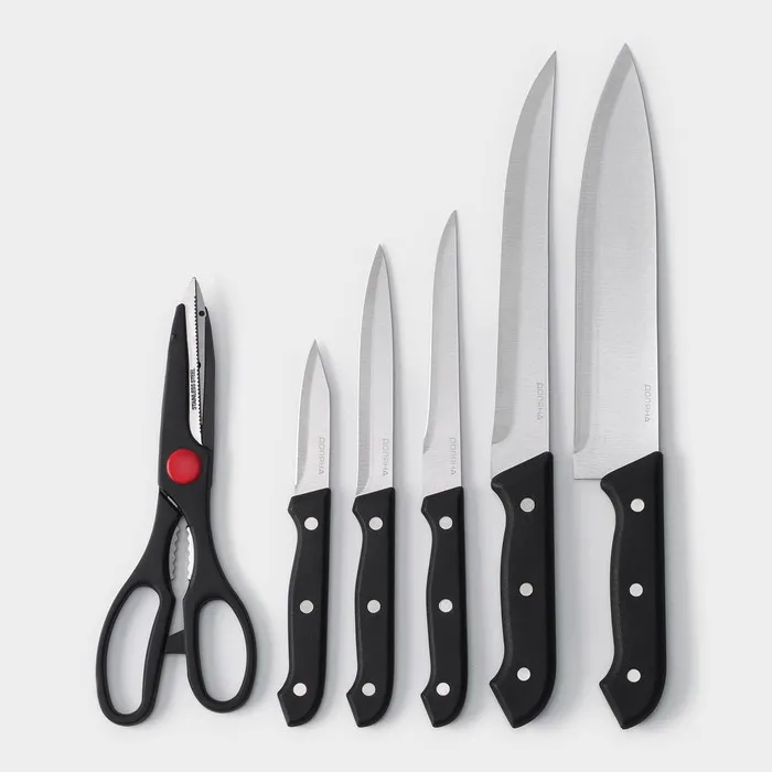 Набор ножей кухонных на подставке Доляна, 6 предметов: ножи 8 см, 11 см, 13 см, 19 см, 20 см, ножницы, чёрный — Характеристики