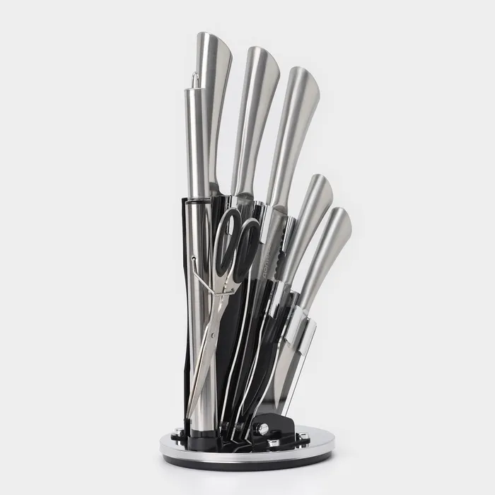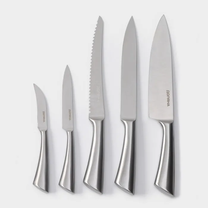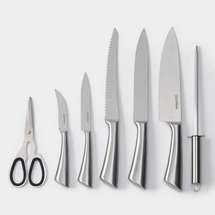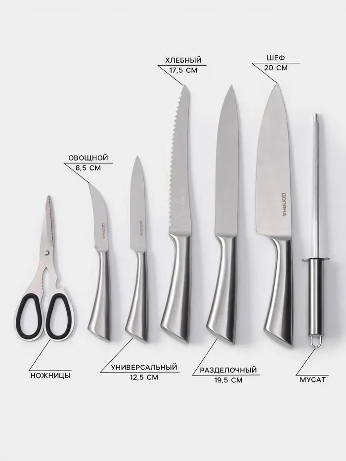 Набор ножей кухонных на подставке Доляна Ardone, 7 предметов: 5 ножей, мусат и ножницы, хромированный — Характеристики