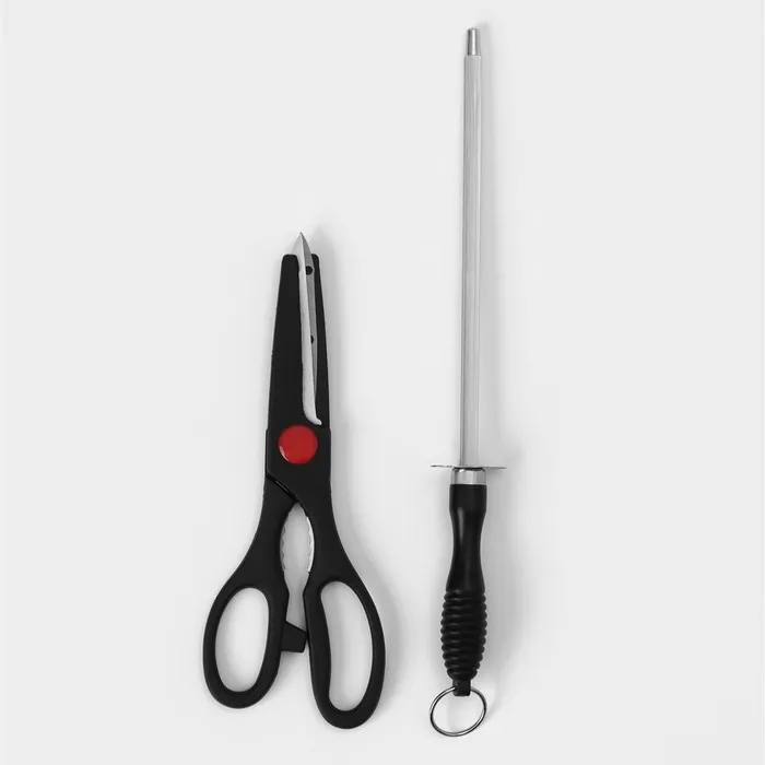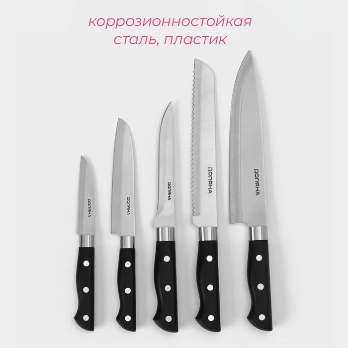 Набор ножей кухонных на подставке Доляна «Кронос», 7 предметов: 5 ножей, мусат и ножницы, чёрный — Характеристики