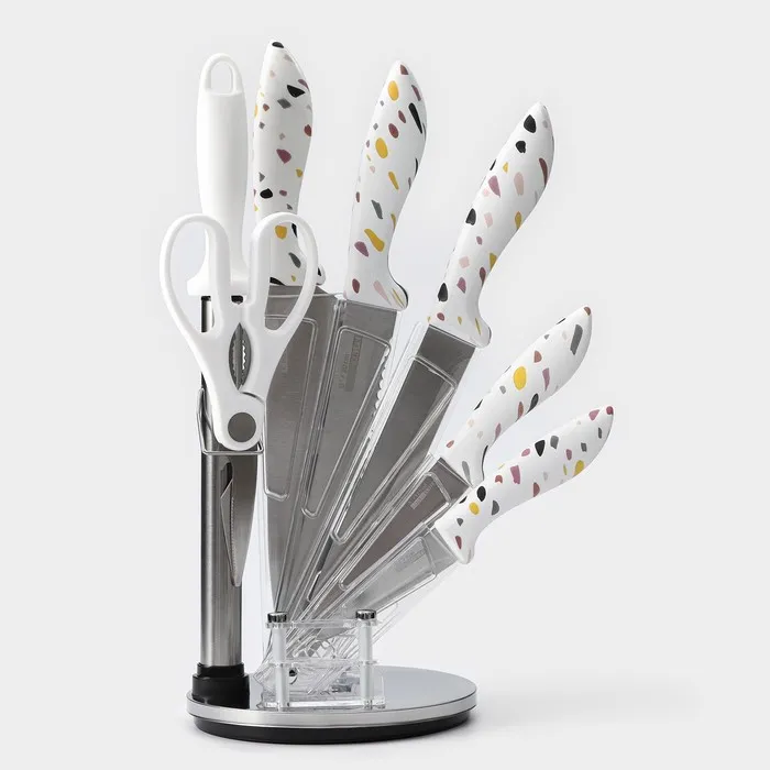 Высококачественная нержавеющая сталь: Лезвия ножей изготовлены из прочной и долговечной нержавеющей стали, которая обеспечивает высокую прочность и устойчивость к коррозии. Благодаря этому, ваши ножи будут служить вам верой и правдой на протяжении многих лет.Эргономичные рукоятки: Ручки ножей выполнены из высококачественного материала, который обеспечивает удобный и безопасный захват. Благодаря продуманной форме ручек, ваши руки будут меньше уставать при использовании ножей.Стильная подставка: Набор ножей поставляется с прочной и устойчивой подставкой, которая не только стильно выглядит, но и обеспечивает безопасное хранение ваших ножей. Подставка также позволяет легко выбрать нужный нож без необходимости поиска его в ящике.Идеальный баланс: Благодаря точно выверенной балансировке, ножи обладают идеальным весом, что обеспечивает комфорт и безопасность при использовании.