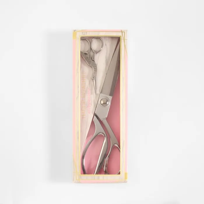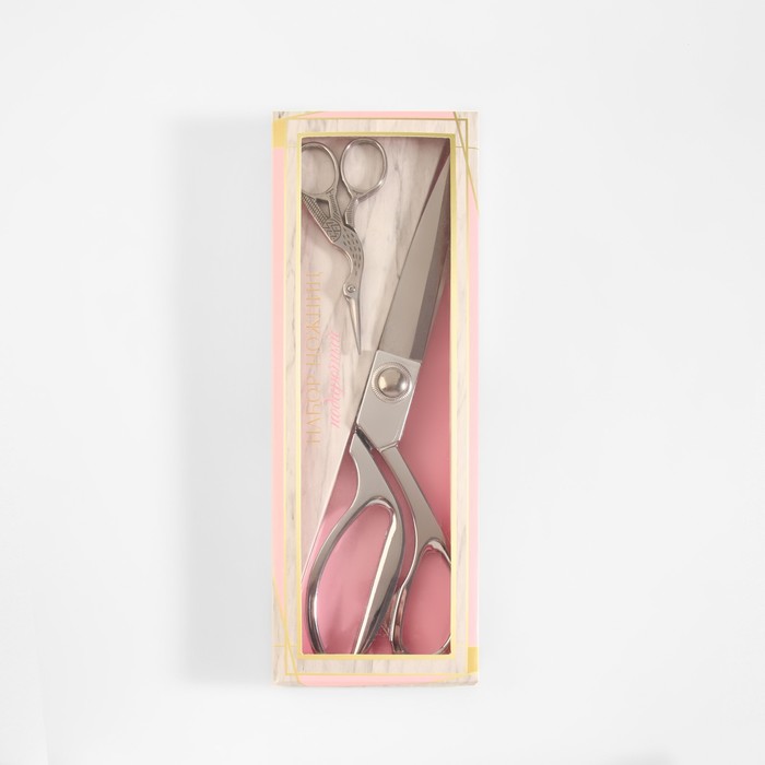 Набор ножниц в дизайнерской упаковке содержит: закройные ножницы 9", 23,5 см и вышивальные ножницы «Цапельки», 9,5 см. Комплект станет замечательным подарком для рукодельниц, портных и просто любителей шитья и вышивки.