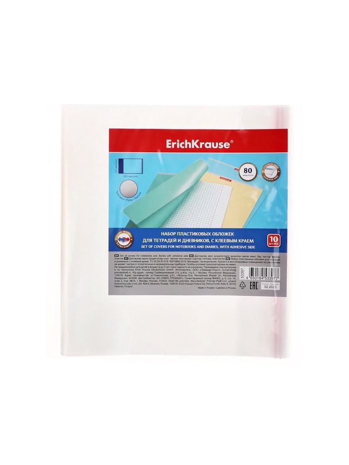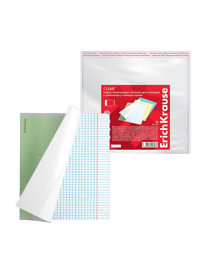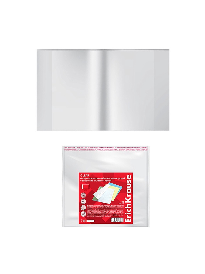 Набор обложек ПП 10 шт, 212 х 395 мм, 80 мкм, ErichKrause "Fizzy Clear", для тетрадей и дневников, с клеевым краем, с тиснением, универсальная — Характеристики