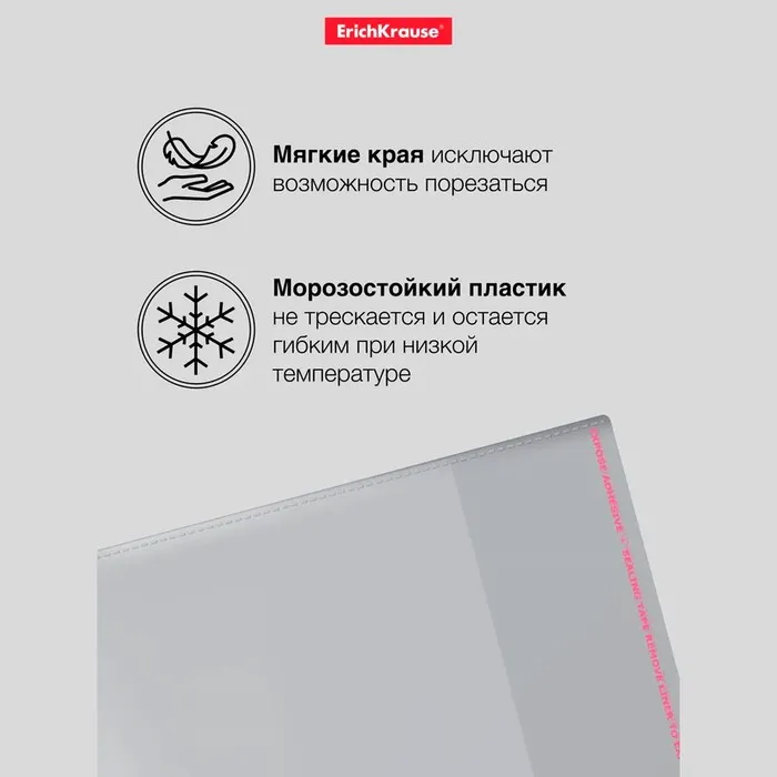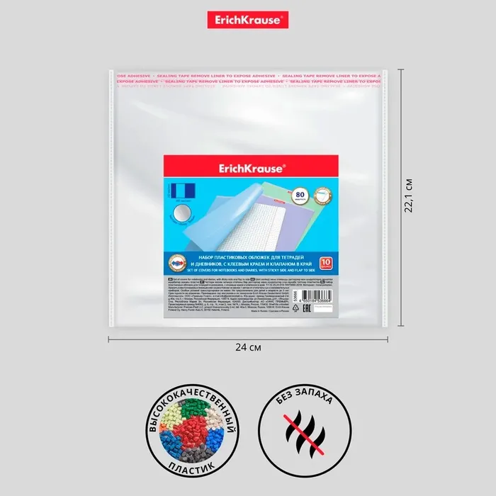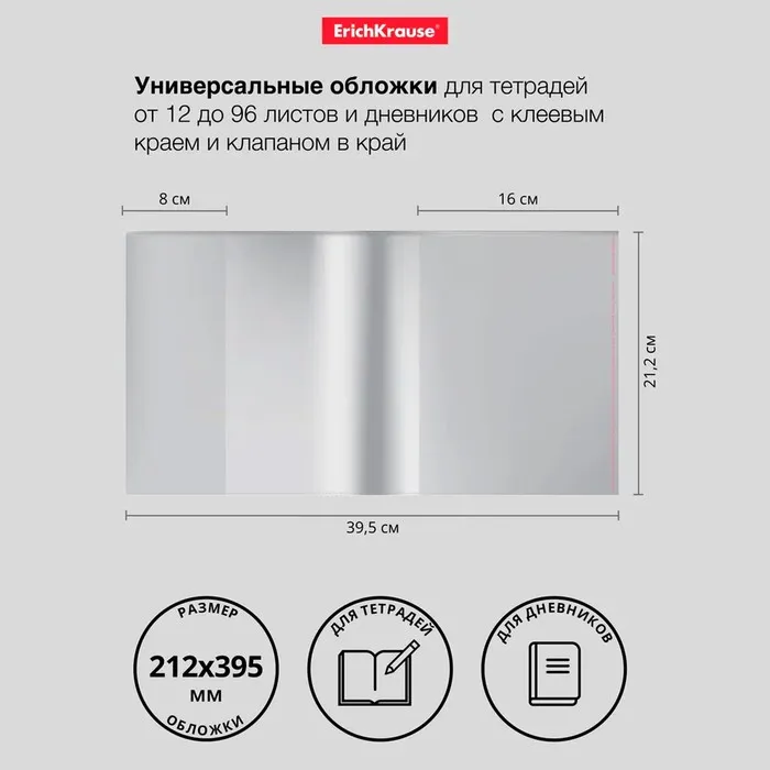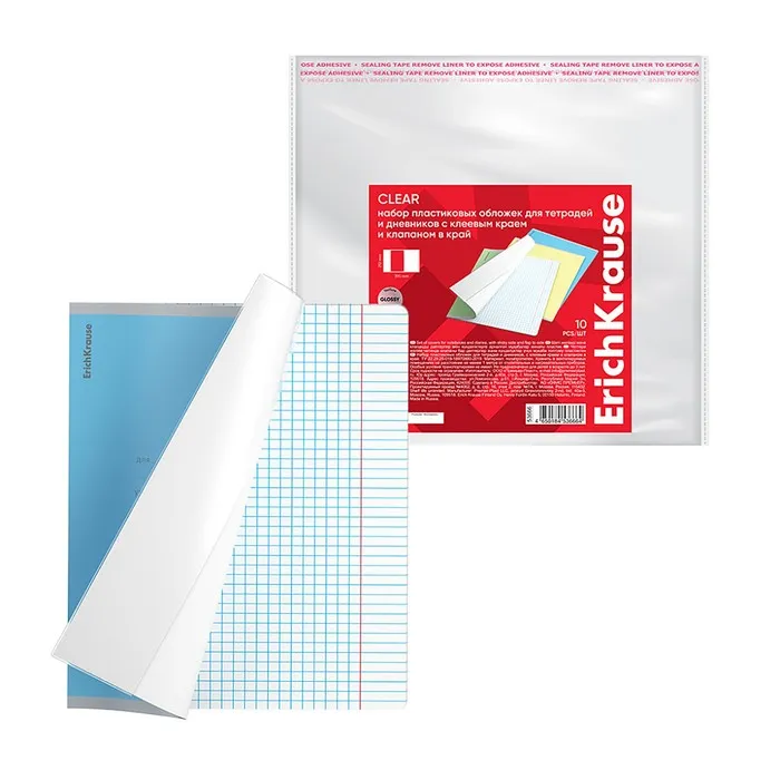 Набор обложек ПП 10 шт, 212 х 395 мм, 80 мкм, ErichKrause "Glossy Clear", для тетрадей и дневников, с клеевым краем и клапаном в край, глянцевые — Характеристики