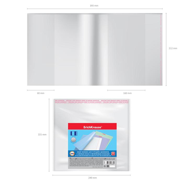 Набор обложек ПП 10 шт., 212×395 мм, 80 мкм, ErichKrause Fizzy Clear, для тетрадей и дневников, с клеевым краем и увеличенным клапаном, с тиснением — Характеристики
