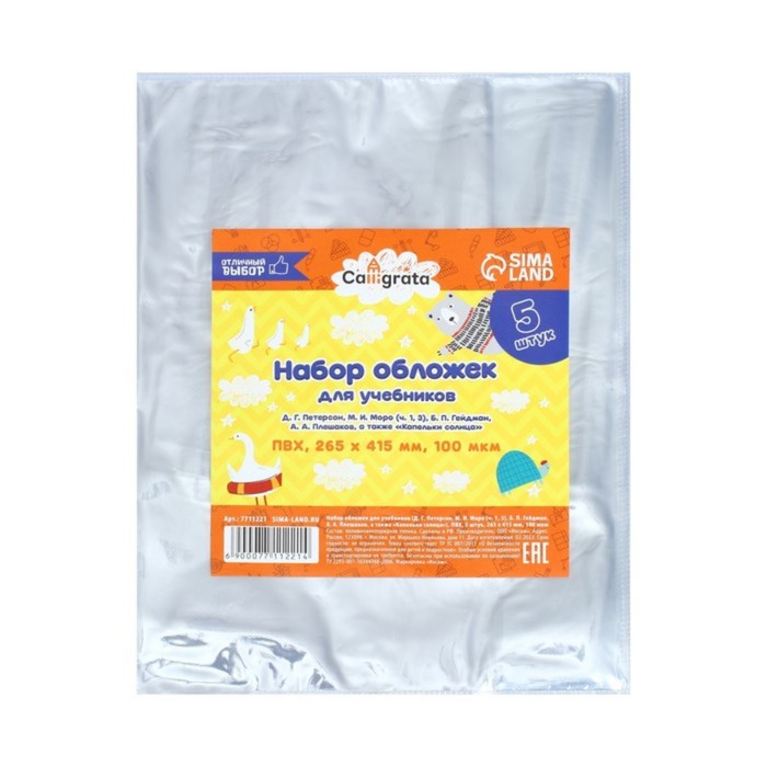 Набор обложек ПВХ 5 штук, 265 х 415 мм, 100 мкм, для учебников Петерсон, Моро (ч.1,3), Гейдман, «Капельки солнца», Плешаков — Характеристики
