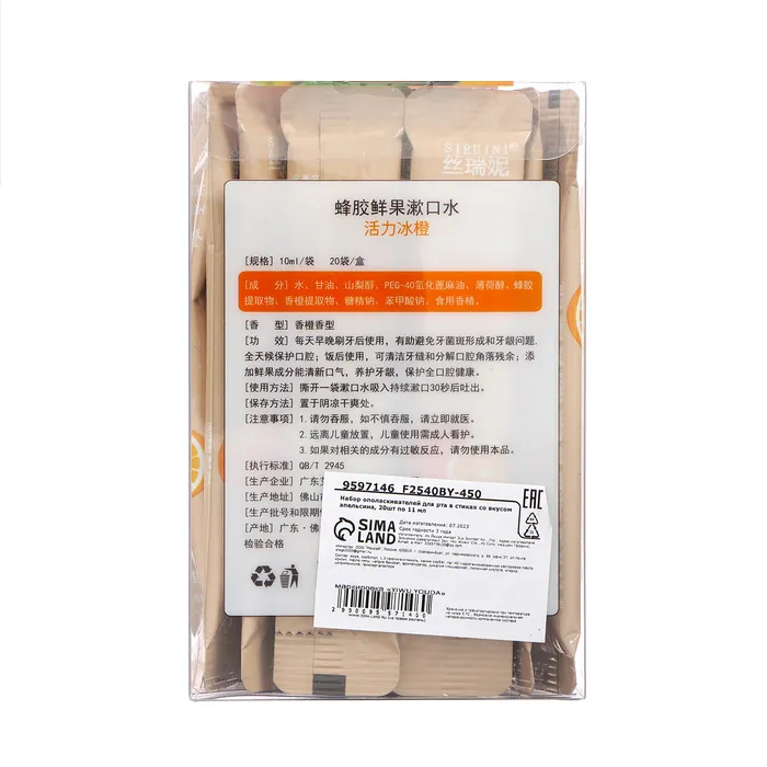 Состав: вода, сорбитол, 1,3-пропиленгликоль, калия сорбат, пэг-40 гидрогенизированное касторовое масло, ксилит, масло мяты, натрия бензоат, ароматизатор апельсина, дикалия глицирризат, лимонная кислота, хлорид цетримониума, трихлоргалактоза.