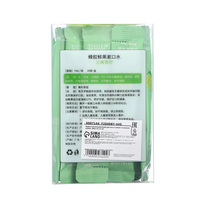Состав: вода, сорбитол, 1,3-пропиленгликоль, калия сорбат, пэг-40 гидрогенизированное касторовое масло, ксилит, масло мяты, натрия бензоат, ароматизатор лайма, дикалия глицирризат, лимонная кислота, хлорид цетримониума, трихлоргалактоза.