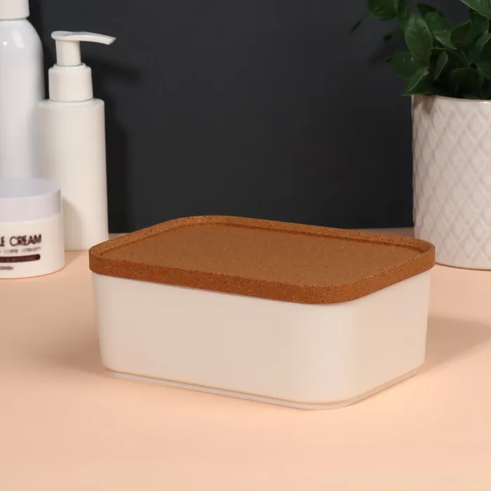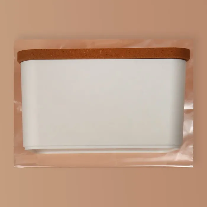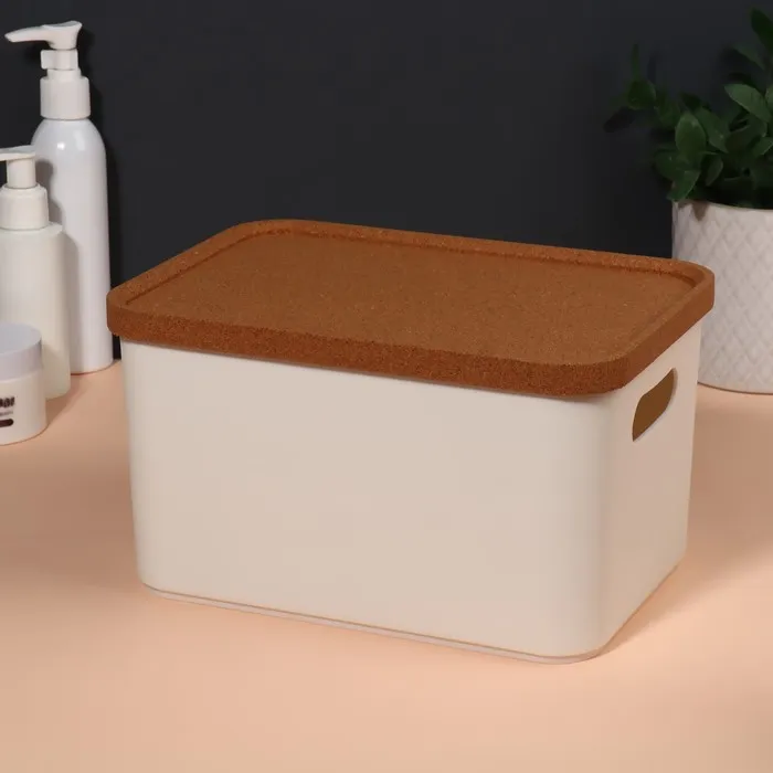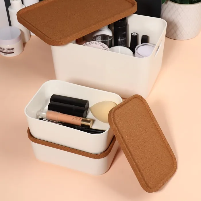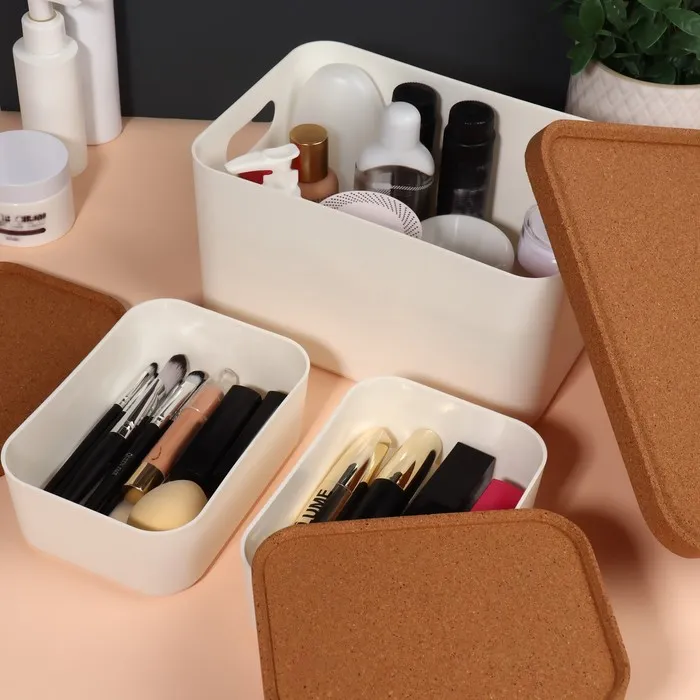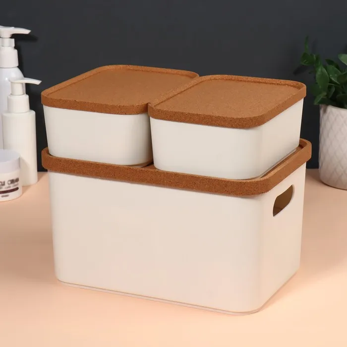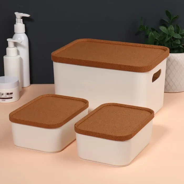 Набор состоит из трех органайзеров: один вместительный контейнер объемом 2,4 л и два компактных — по 0,76 л. Органайзеры оснащены крышками из экологичного пробкового дерева, которые защищают содержимое от пыли и позволяют хранить мелкие предметы с удобством. Крышки также можно использовать как отдельные подставки для аксессуаров, что добавляет изделию функциональности.