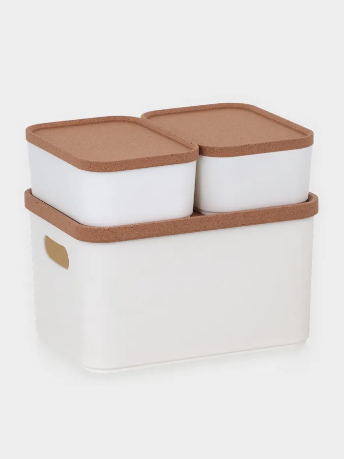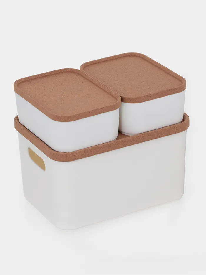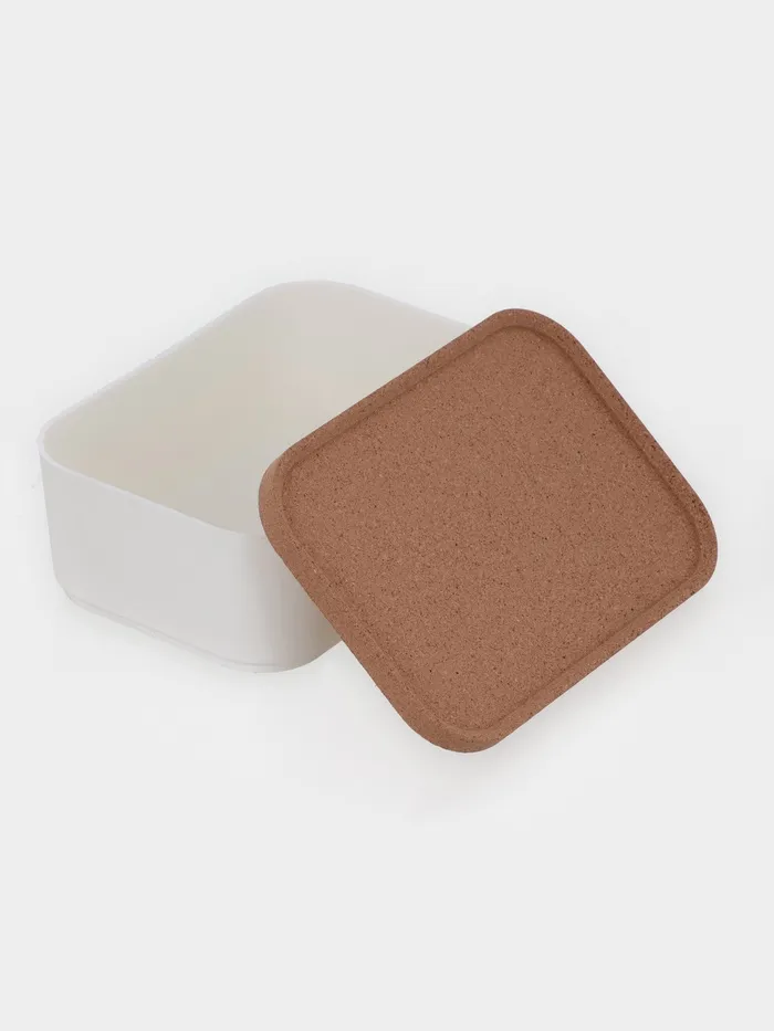 Набор состоит из 3 органайзеров с крышками: одного большого, объёмом 2,4 л, и двух маленьких, объёмом 0,76 л. Крышки сделаны из экологически чистого, безопасного и возобновляемого материала — коры пробкового дерева. Её срезают, когда дерево достигает 25-летнего возраста. Процесс повторятся каждые 9–10 лет, что помогает восстановить слой коры и не вредит деревьям.