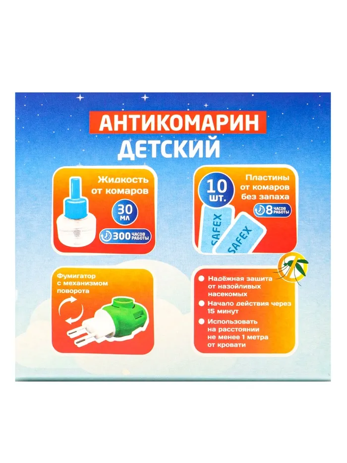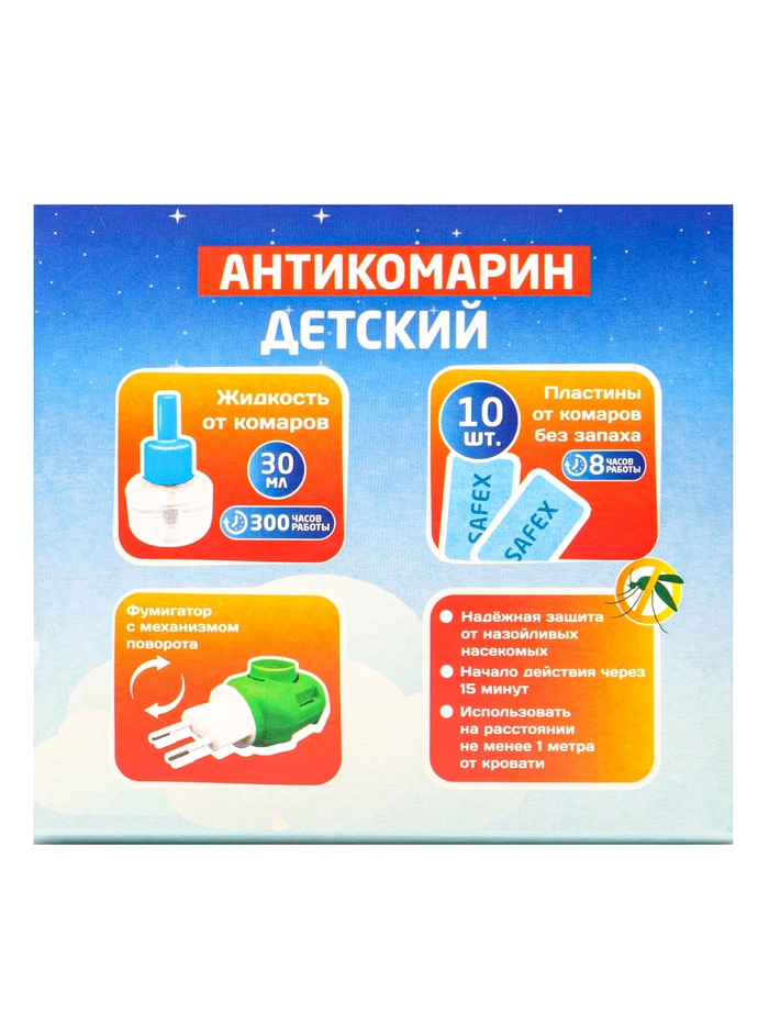 Набор от комаров SAFEX KIDS (фумигатор+жидкость+пластины), детский, 1 шт. — Характеристики