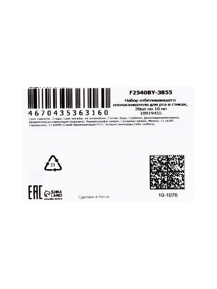 Каждый стик содержит 10 мл готового к применению отбеливающего ополаскивателя — оптимальный объём для одного полноценного полоскания. Индивидуальная упаковка исключает необходимость дозирования и обеспечивает максимальную гигиеничность использования. Компактные стики легко брать с собой на работу, в поездки, командировки или использовать дома.