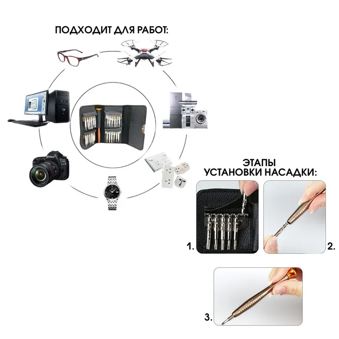 Набор маленьких отверток состоит из 24 сменных насадок с магнитными наконечниками для разборки, которые подходят для ремонта большинства современных часов, электронных устройств, ноутбуков, мобильного телефона, ПК, планшетов, очков, фотоаппаратов, игрушек и для мелкого ремонта автомобиля.