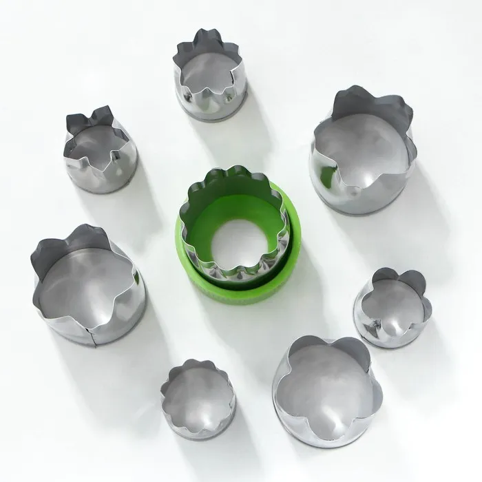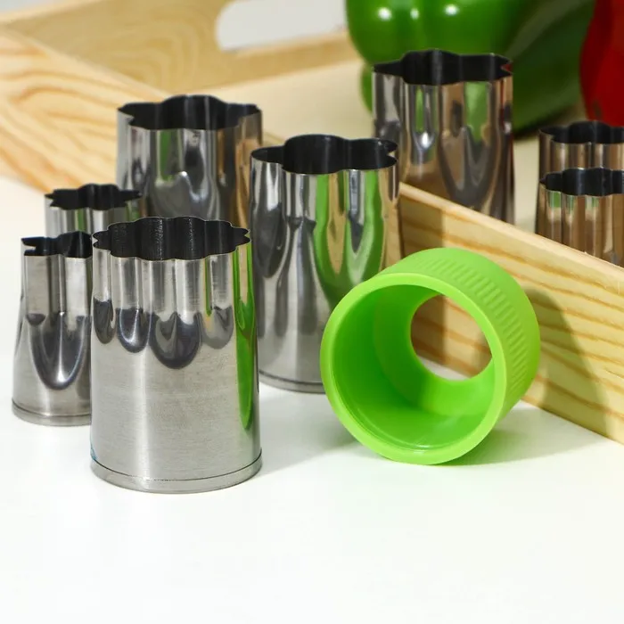Набор овощерезок с лезвиями из нержавеющей стали — это 8 практичных инструментов для нарезки и формирования овощей. Зелёный цвет ручек делает набор ярким и легко узнаваемым на кухне. Каждый предмет предназначен для своей задачи: от тонкого среза до крупного кубика. Компактность и удобство хранения делают его идеальным для домашней готовки.