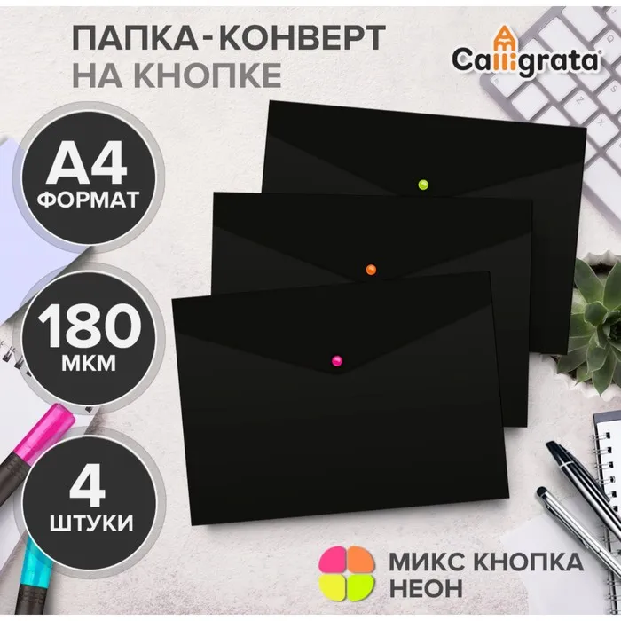 Набор папок-конвертов на кнопке 4 штуки, А4, 180 мкм, Calligrata No Secret, непрозрачные, черные, микс цветных кнопок — Характеристики