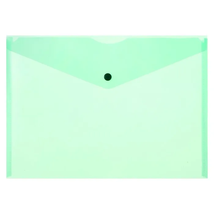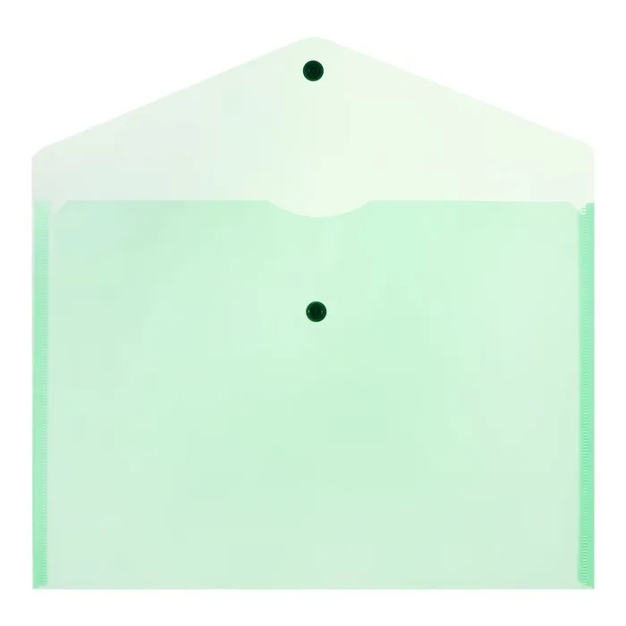 Размер: 24x33 смФормат: А4;Цвет: зелёныйВид товара папка-конвертСпособ фиксации кнопкаМатериал пластикОриентация горизонтальнаяТолщина материала 120 мкмВнешняя перфорация нетВместимость, в листах 100С расширением нетТекстура глянцевая