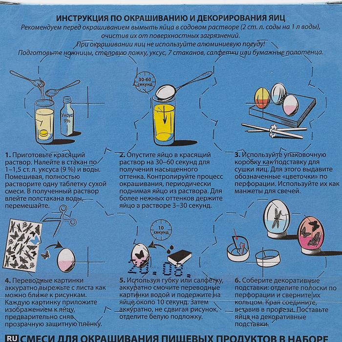 Набор предназначен для декорирования пасхальных яиц. Рекомендуем перед окрашиванием вымыть яйца в содовом растворе, очистив их от поверхностных загрязнений.