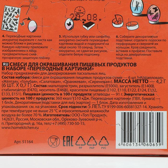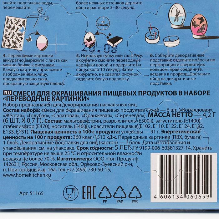 Состав: смеси для окрашивания пищевых продуктов сухие - 6 шт. (коралловая, жёлтая, голубая, салатовая, оранжевая, сиреневая), блок переводных картинок, декоративные подставки для яиц - 1 блок.