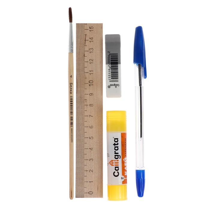 Тетрадь 12 листов, клетка;Тетрадь 12 листов линейкаТетрадь 12 листов косая линейкаНабор обложек 210 х 350 мм 10 штукРучка шариковая - 1 шт.Карандаш чернографитный с ластиком - 1штЛастик комбинированный - 1шт.Точилка с контейнером -1шт.Акварель 6 цветов медовая - 1шт.Пластилин 6 цветов 90г - 1шт.Доска для лепки пластик А4 - 1 шт.Карандаши 6 цветов в картонной коробке - 1шт.Бумага цветная А4 - 1 шт.Альбом для рисования А4 16 листов на - 1 шт.Пенал пластиковый - 1 шт.Линейка деревянная 15 см - 1 шт.Кисть белка круглая № 4 ручка - 1 шт.Клей-карандаш 9 грамм - 1 шт.Папка с ручками пластик А4 - 1 шт.