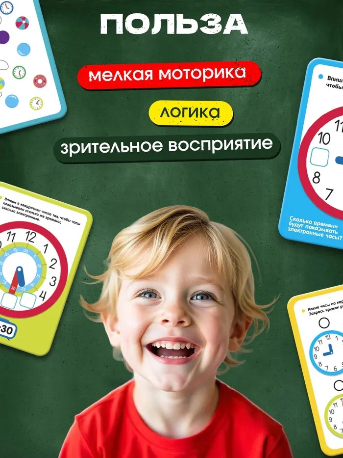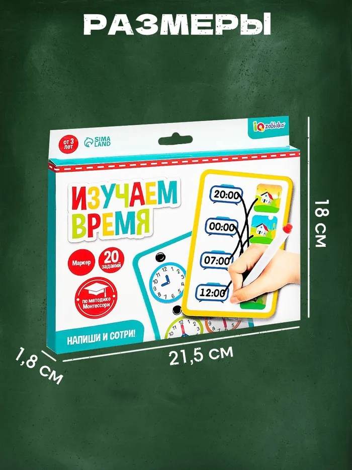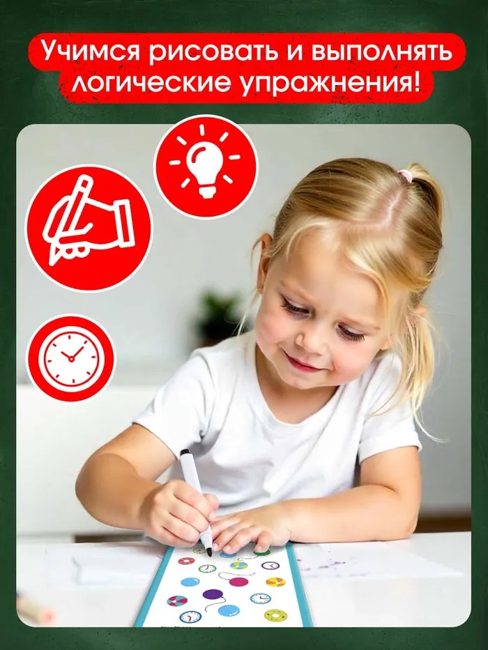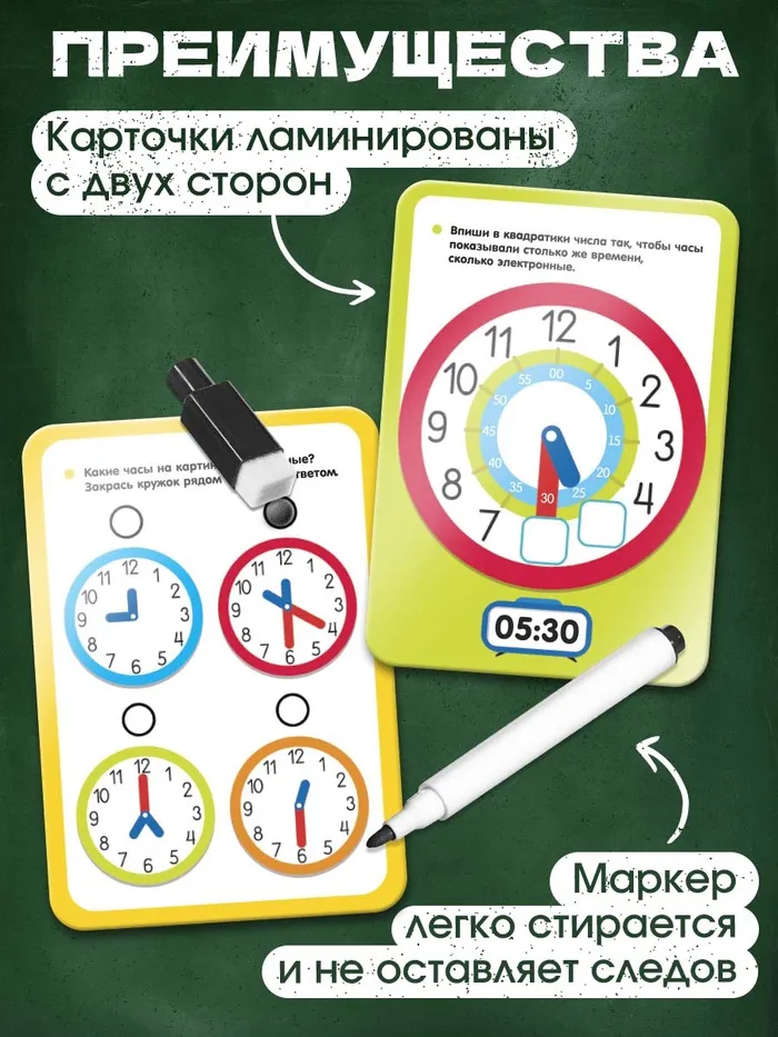 С набором «Пиши-стирай» ребёнок научится рисовать и выполнять логические упражнения. В процессе игры малыш сможет легко и просто определять время. Он потренируется писать цифры и запомнит их.