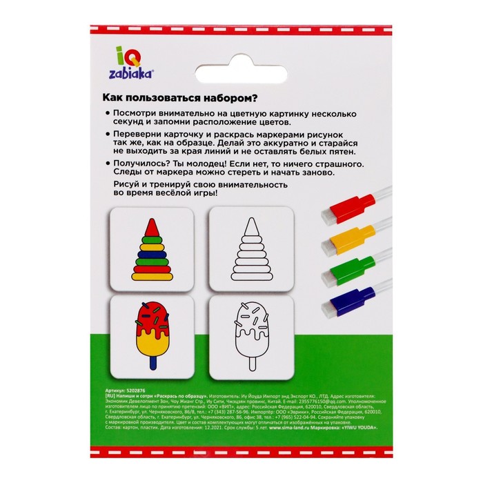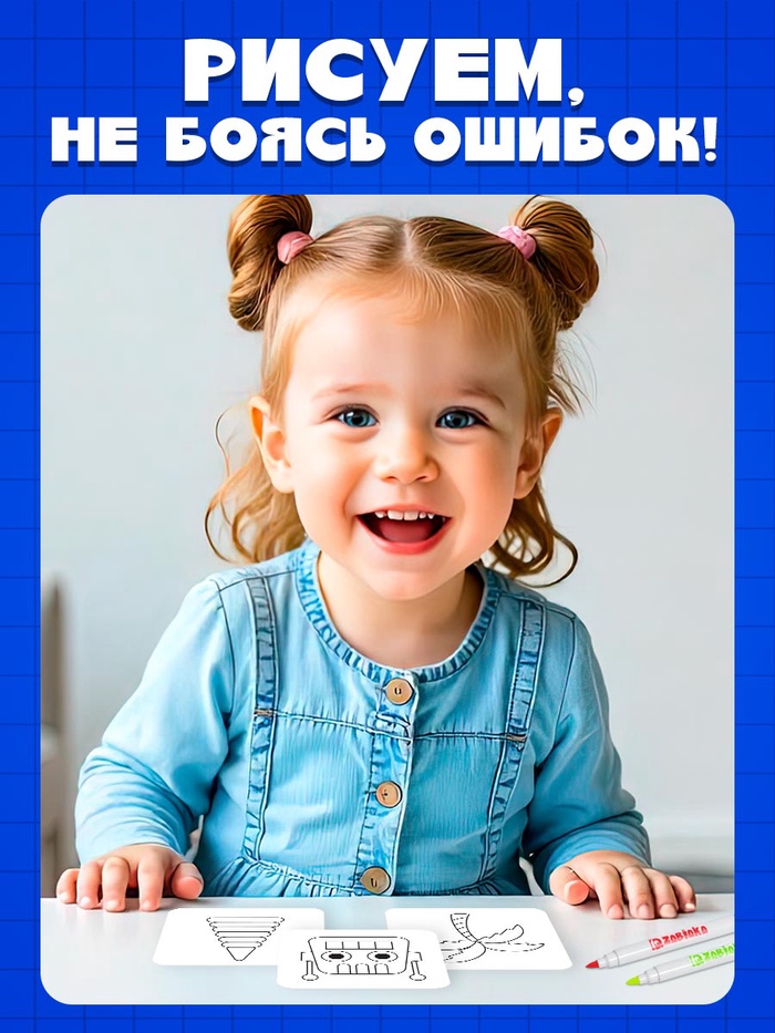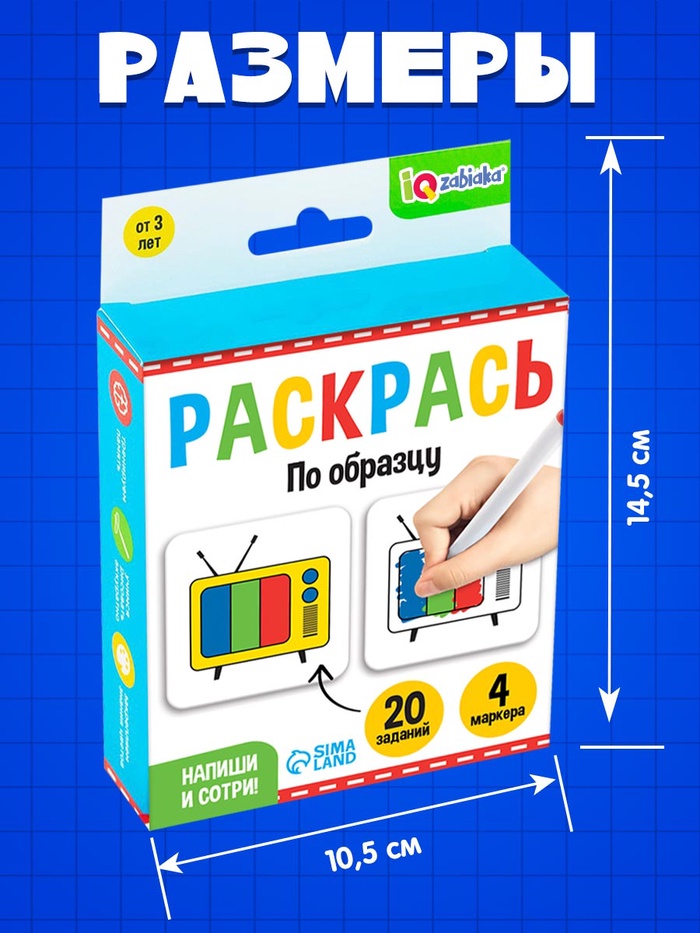 В комплекте малыш найдёт 4 маркера и 20 заданий.