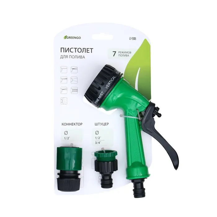 Набор: пистолет для полива, 7 режимов, коннектор 1/2" (12 мм), адаптер 1/2"−3/4" (12 мм−19 мм), Greengo