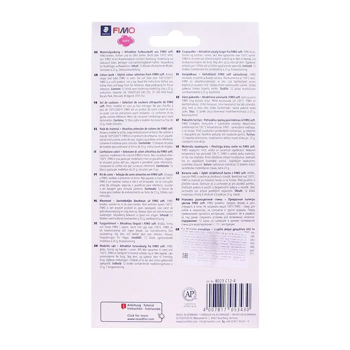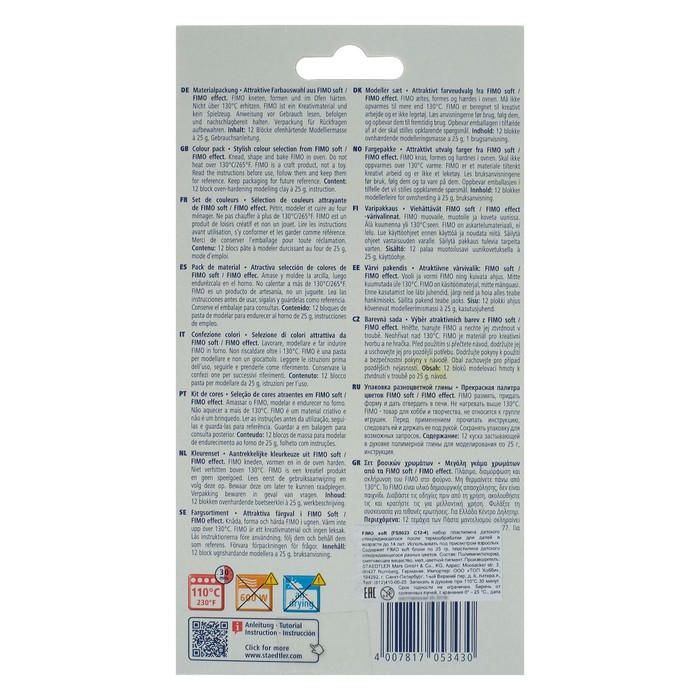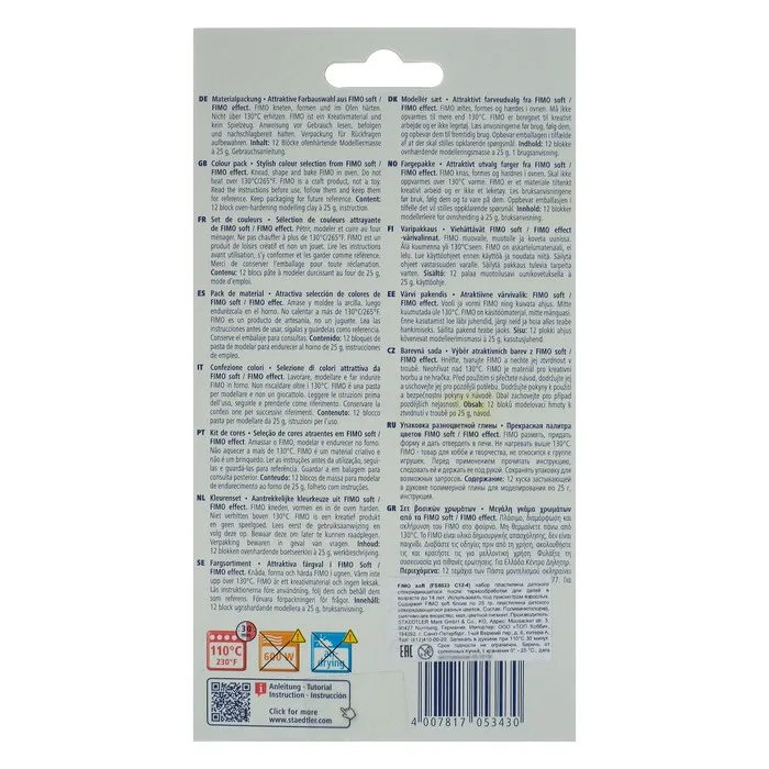 Полимерная глина FIMO Professional подходит для начинающих мастеров и професиональных художников.ОсобенностиМасса мягкая, поэтому вы легко придадите ей нужную форму.Цвета можно смешивать для получения необходимых оттенков, которые сохранятся после обжига.После запекания изделия становятся прочными и долговечными.Упаковка легко открывается без использования ножа. Если вы не полностью израсходовали блок, то остатки можно завернуть в упаковку — так глина лучше сохранится.Термическая обработка. Готовое изделие поместите внутрь духовки на тарелке, стекле или фольге. Запекайте при температуре 110 °С. Чем больше толщина элемента, тем дольше нужно запекать (вплоть до 30 минут). Температура обжига не должна пpeвышaть 130 °С.Пластика рекомендована для детей старше 8 лет.