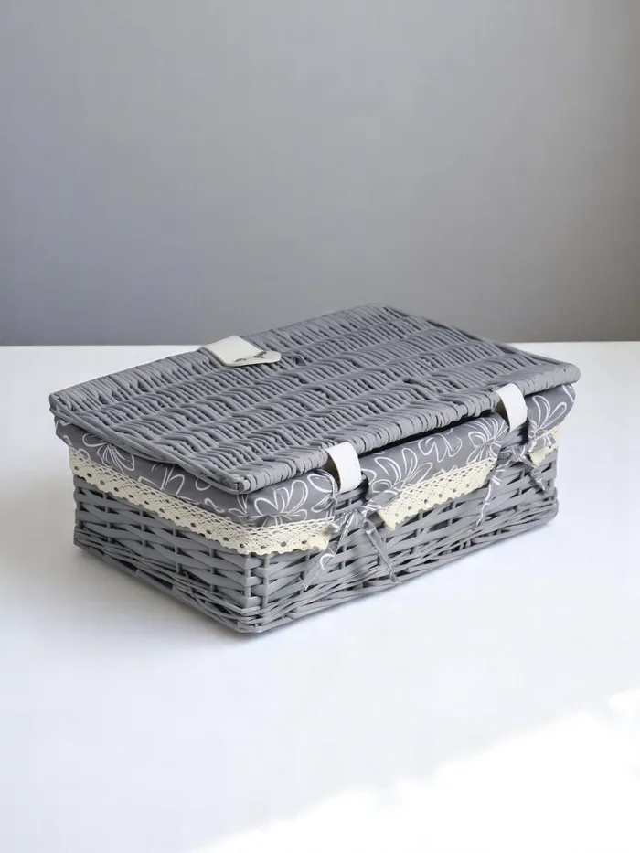 Серый цвет натуральной лозы в сочетании с экокожей ручек и застёжек придаёт изделиям особую элегантность. Тканевая подкладка внутри не только защищает содержимое, но и добавляет уюта — такие корзины приятно брать в руки и рассматривать вблизи.