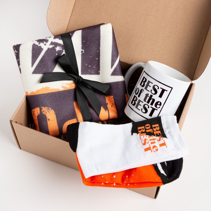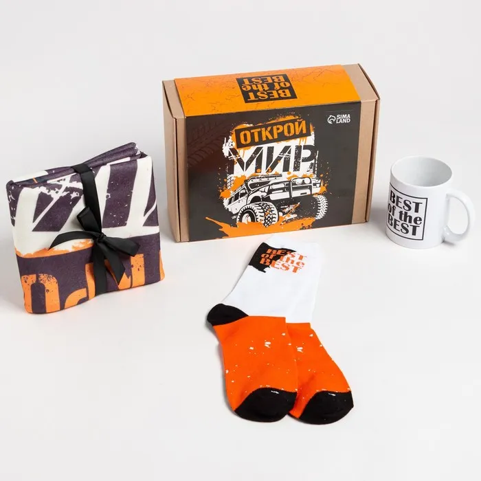 В подарочный набор входит: плед 75 х 100 см, носки размер 41-44 (27-29 см), кружка 320 мл.